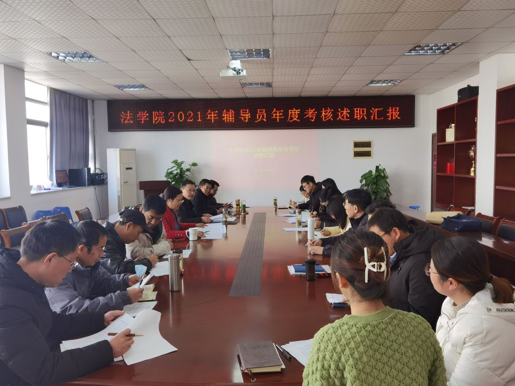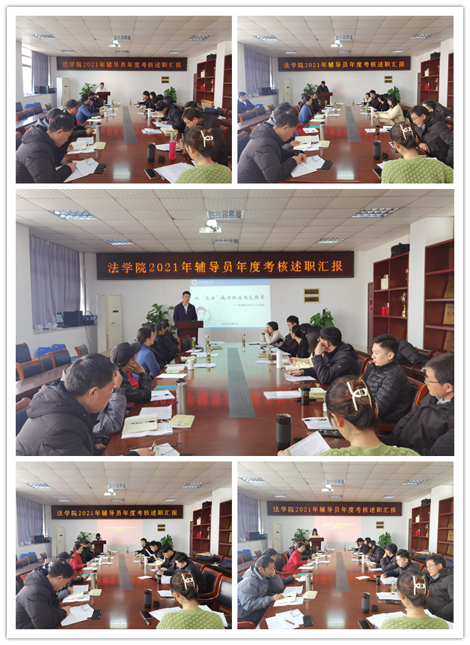 张玉新首先介绍学校有关工作要求,详细布置学院2021年度辅导员考核工作安排。法学院11位辅导员依次进行述职述廉汇报,主要汇报工作理念、工作目标、重点工作、工作成绩等内容,重点介绍了思想引领、班风学风建设、党团工作、学生干部培养、第二课堂等方面的举措和成绩。考核小组结合考核对象日常表现和汇报情况进行评议打分。