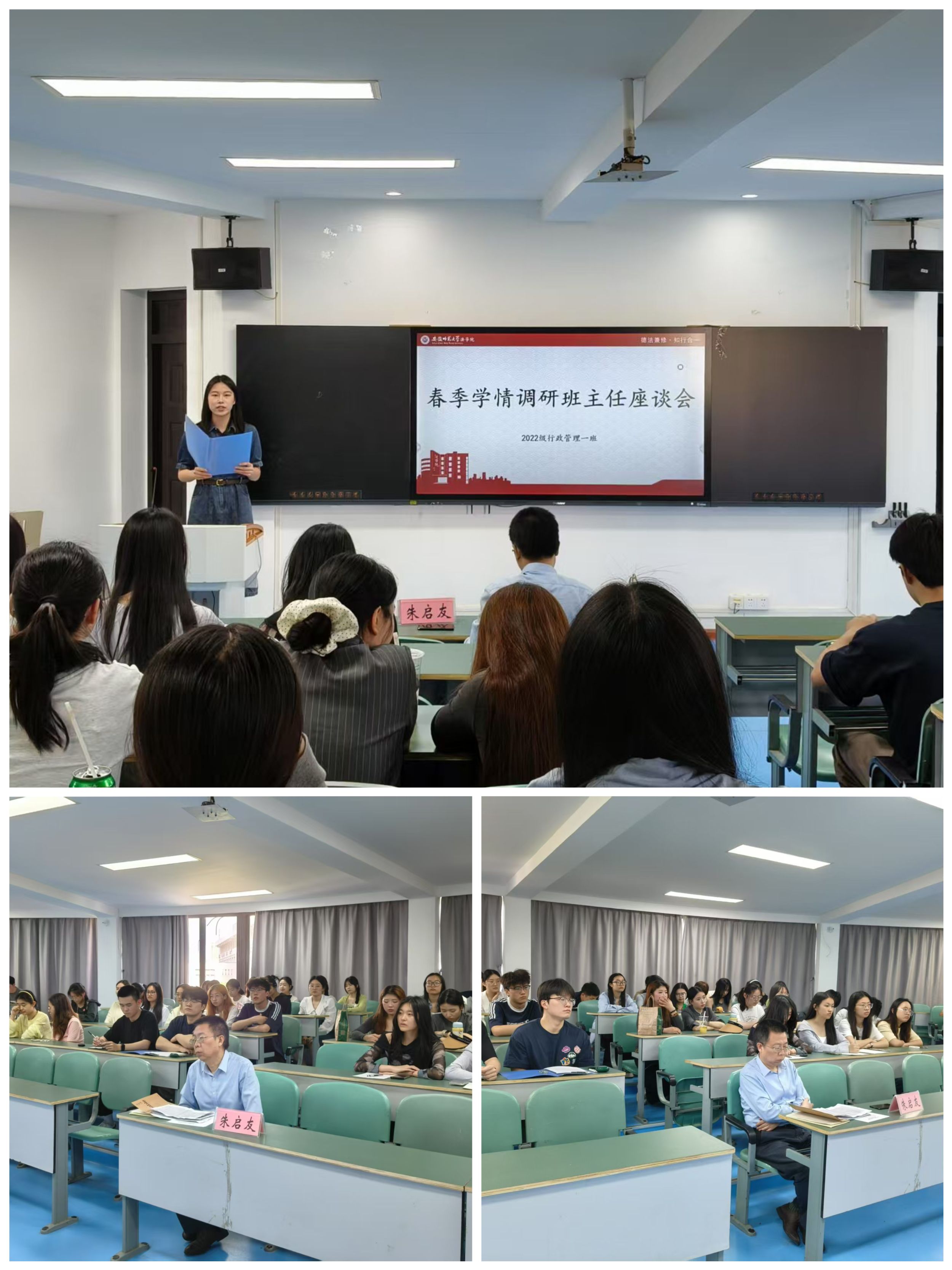 为深入贯彻落实大学生护航行动计划,切实解决学生成长发展中的实际问题,4月18日下午,2022级行政管理专业在行政楼314教室召开春季学情调研班主任座谈会。会议由张宏玮主持,班主任朱启友出席指导,全体学生参与。