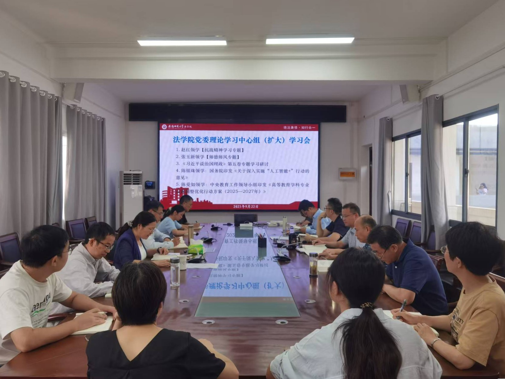9月22日,法学院召开党委理论学习中心组(扩大)学习会,开展抗战精神、师德师风、《习近平谈治国理政》第五卷等专题学习研讨。会议由院党委书记赵红主持,院党委委员、领导班子成员、党政管理人员参加会议。