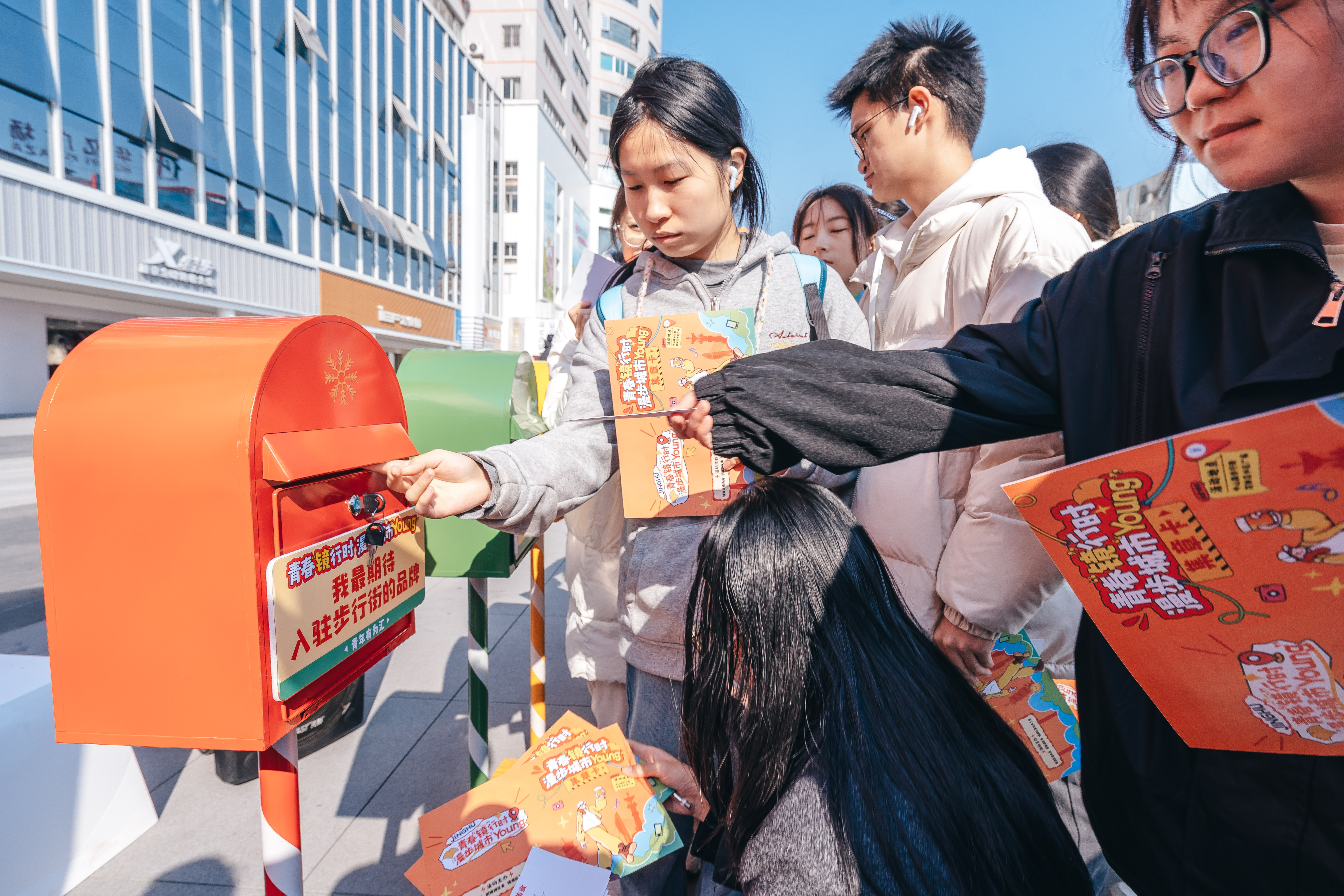 活动伊始,同学们领取专属“集章卡”,开启趣味打卡之旅。现场设置【潮玩福利社】、【青春活力带】、【美食能量站】、【青年拼图墙】等多个主题区域打卡点,同学们纷纷前往互动区进行挑战。一块块拼图在大学生们手中汇聚,逐渐勾勒出青春与城市交融的美好蓝图,中山路步行街上青年学子的身影展现着城市的蓬勃朝气。