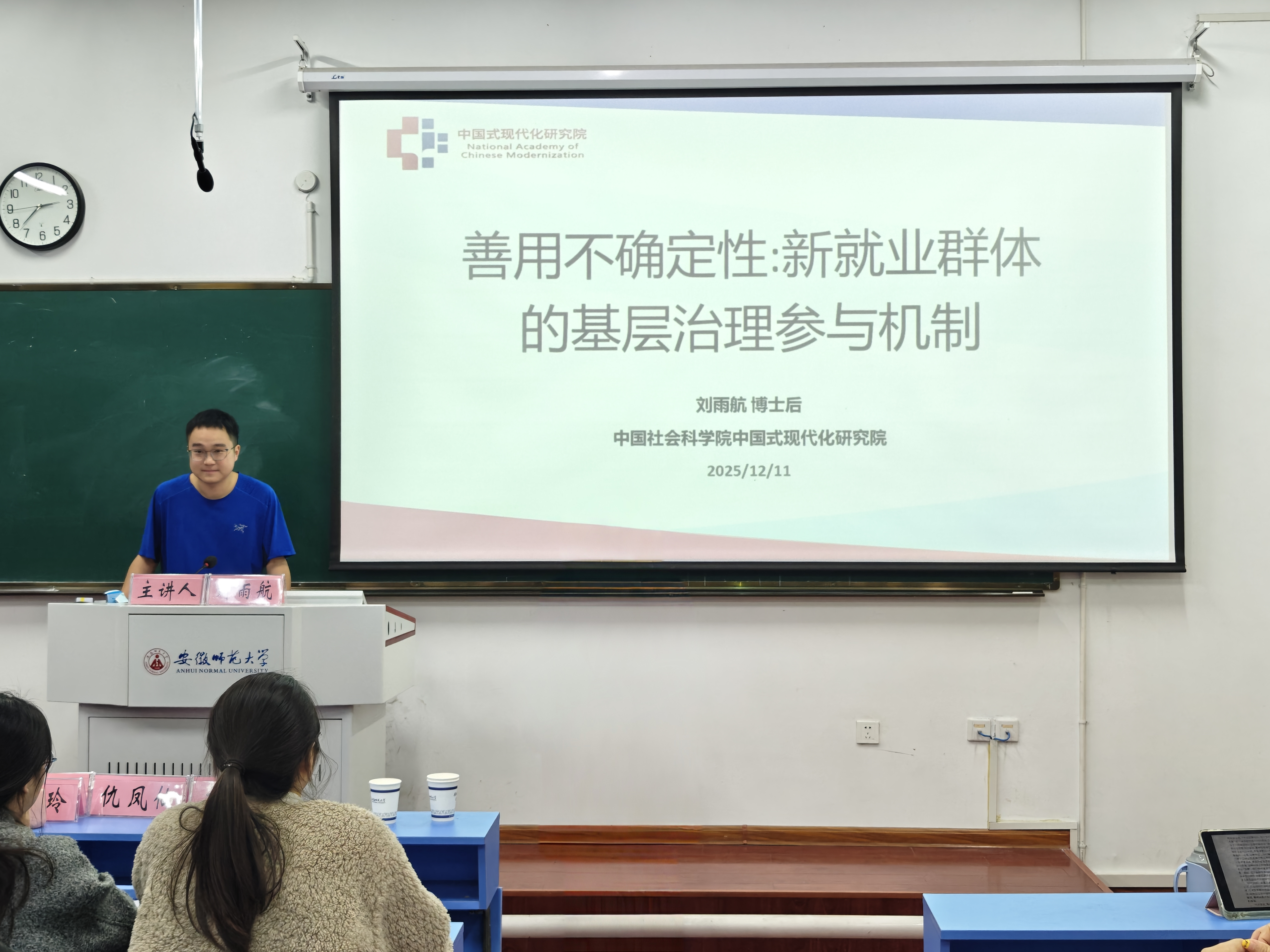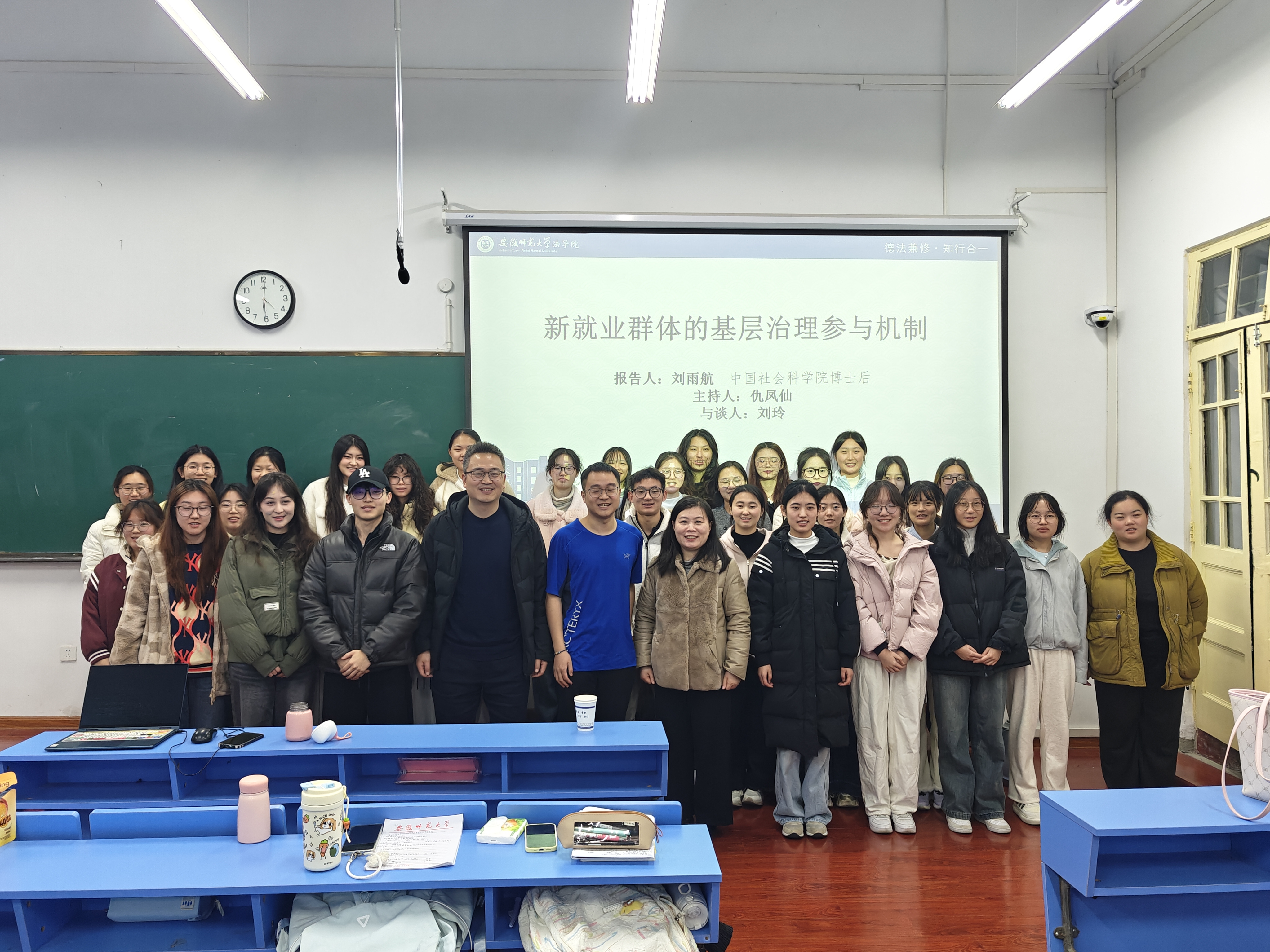 2025年12月11日下午,法学院社会工作系校友、中国社会科学院中国式现代化研究院博士后刘雨航博士做《善用不确定性 新新就业群体基层治理参与机制》研究分享。社会工作系主任仇凤仙教授主持,刘玲老师担任与谈人,副院长陈爱如等社会工作专业 师生 100余人 参与分享交流。