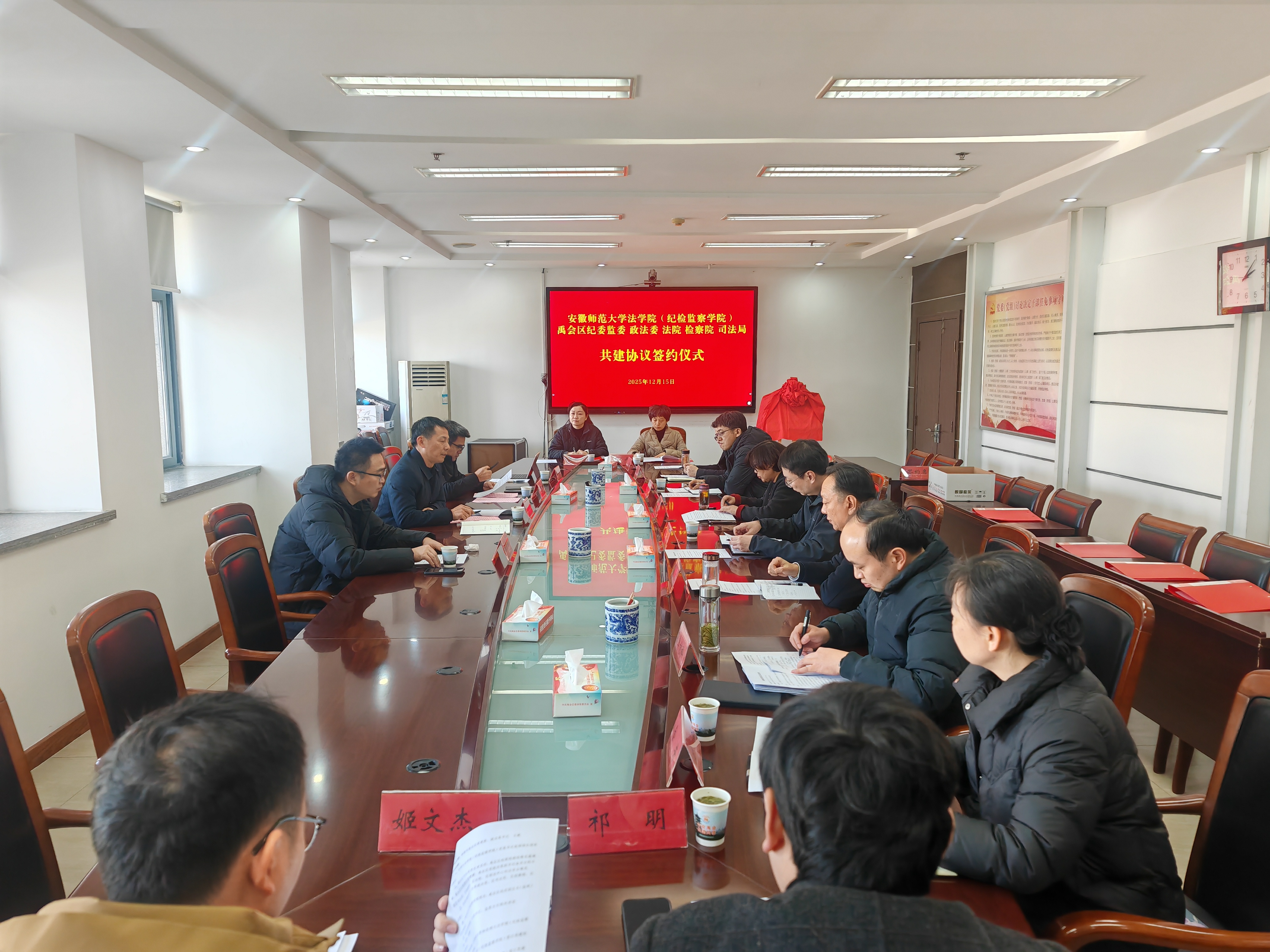 12月15日下午,法学院与蚌埠市禹会区委政法委、纪委、人民法院、人民检察院、司法局签署合作签约、挂牌仪式在蚌埠市禹会区人民政府举行。会议由蚌埠市禹会区委常委、政法委书记王健主持,禹会区区委常委、纪委书记、监察专员陈侠,区人民法院 、人民检察院、司法局负责人,法学院党委书记张师帅、副院长陈爱如、汪小棠博士和蚌埠市禹会区相关单位领导出席了本次仪式。