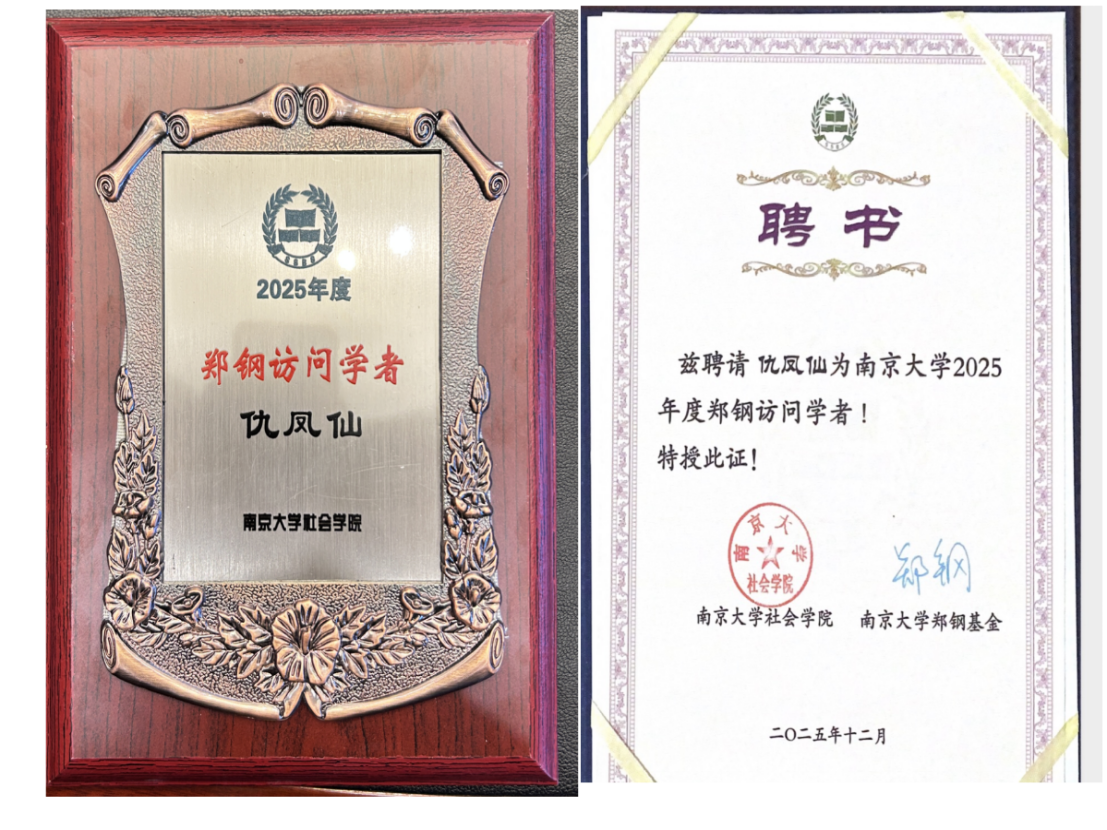 据悉,南京大学社会学院设立的“郑钢访问学者计划”每年仅在国内外高校遴选六至七位具有突出学术潜力的中青年社会学人驻访交流,以其严格的遴选机制和深厚的学术支持,成为国内社会学领域一项具有高认可度的荣誉性访问学者项目。该项目为每位入访学者给付2万元学术津贴、伙食补助、国内交通补贴,并授予“南京大学社会学院郑钢访问学者”荣誉证书及桌立牌匾。作为南京大学历届郑钢学人安徽省唯一入选者,仇凤仙教授此次成功入选该计划,既是对其本人学术贡献的充分肯定,也是对我校社会学学科发展在学界中的认可。仇凤仙教授在南京大学学术交流是我校加强校际深度合作、促进学科发展的积极成效。我校历来重视推动教师与国内外顶尖高校开展学术交流,持续支持教师融入高水平学术平台,为相关学科拓展学术网络、吸收前沿理念奠定坚实基础,进一步助力学校在人才培养、学科建设与社会服务中实现高质量发展。