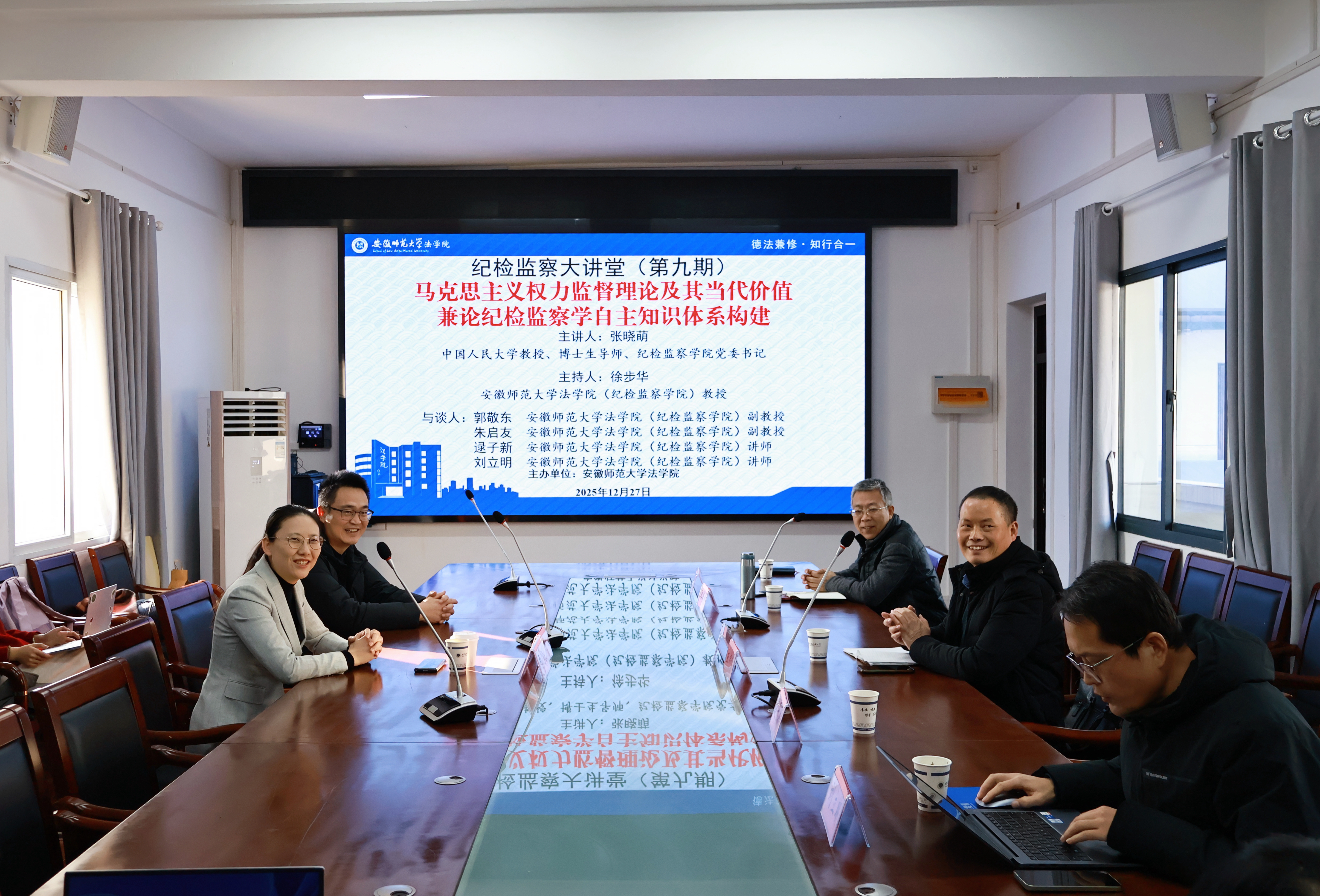 12月27日下午,以“马克思主义权力监督理论及其当代价值——兼论纪检监察学自主知识体系构建”为主题的专题讲座在法学院515举行。本次讲座特邀中国人民大学教授、博士生导师、纪检监察学院党委书记张晓萌主讲,学院副院长陈爱如全程陪同,徐步华教授主持,郭敬东、朱启友等教师与谈。