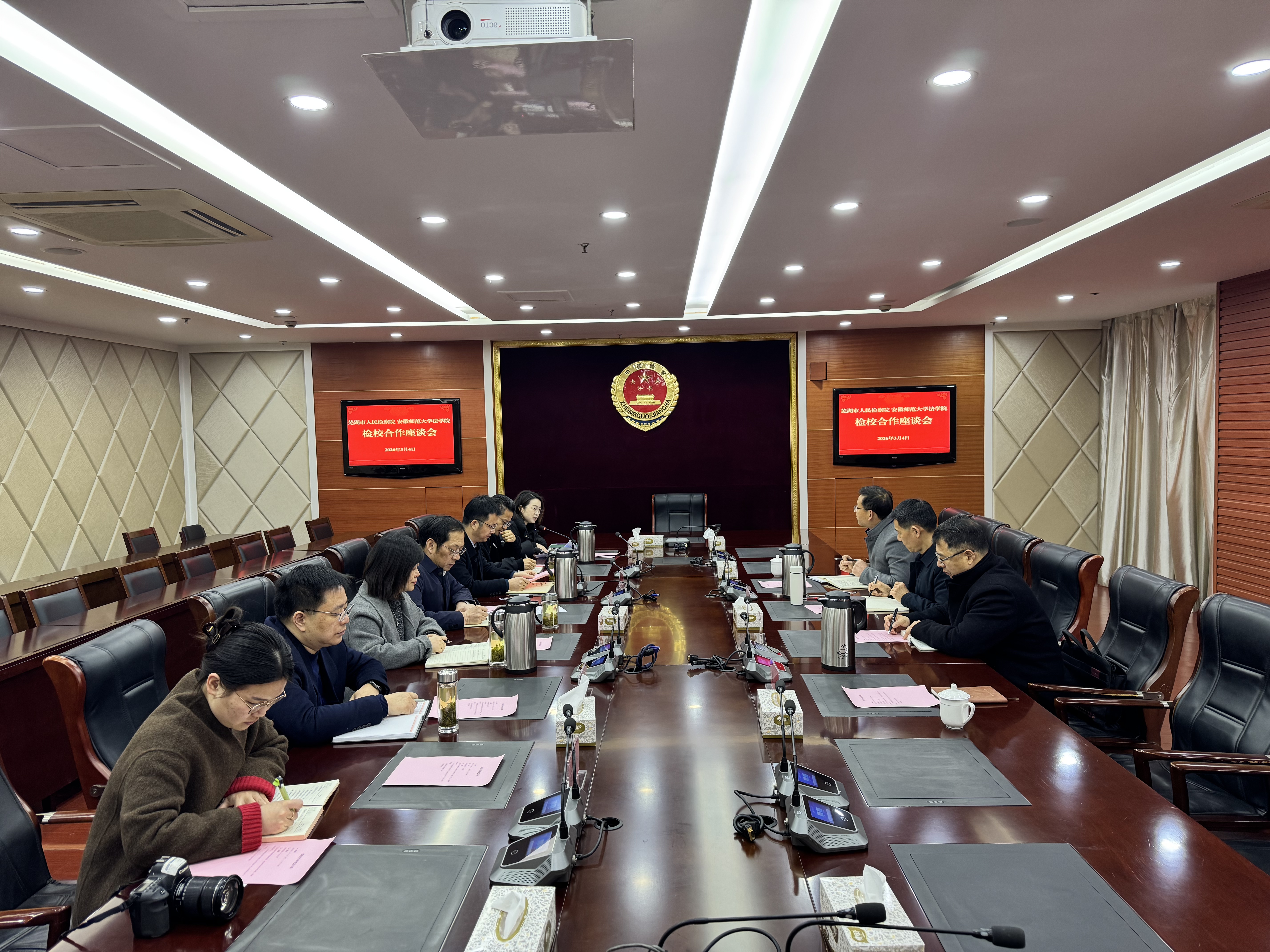 为全面落实教育部、最高检关于深化检校合作的部署要求,以高质效检校合作助力检察工作和教育强国建设高质量发展,3月4日上午,法学院党委书记张师帅、院长郭泽强、党委副书记张玉新、辅导员崔健一行赴芜湖市人民检察院开展合作交流座谈,并看望在岗实习学生。芜湖市人民检察院党组书记、检察长杨基富,党组成员、政治部主任王明,第一检察部主任陈烨,第四检察部主任闫勇,第七检察部副主任黄俊,宣教科副科长郭晨出席座谈会。会议由王明主持。