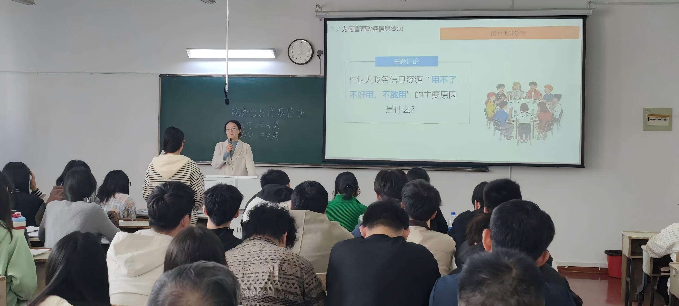 本次讲课内容是“政务信息资源管理概述”,包括什么是政务信息资源、为何管理政务信息资源、如何管理政务信息资源三个方面。首先,什么是政务信息资源。纪媛媛带领同学们回顾了“电子政务的总体框架”,并以“给孩子办户口”的案例导入本节课内容。通过雨课堂弹幕,同学们纷纷表达了自己的认知。在此基础上,纪媛媛总结了政务信息资源的五种类型,并以判断题加深同学们的理解。其次,为何管理政务信息资源。带着“用不了、不好用、不敢用”的问题,同学们分组讨论了其原因。在此基础上,纪媛媛从技术、管理、安全方面进行了分析。第三,如何管理政务信息资源。通过采集、处理、存储、共享、利用五环节的发力,从“跑断腿”到“手机办”,实现了“用得了、用得好、用得安”,让信息为人民服务。最后,纪媛媛对本节课内容进行了总结。