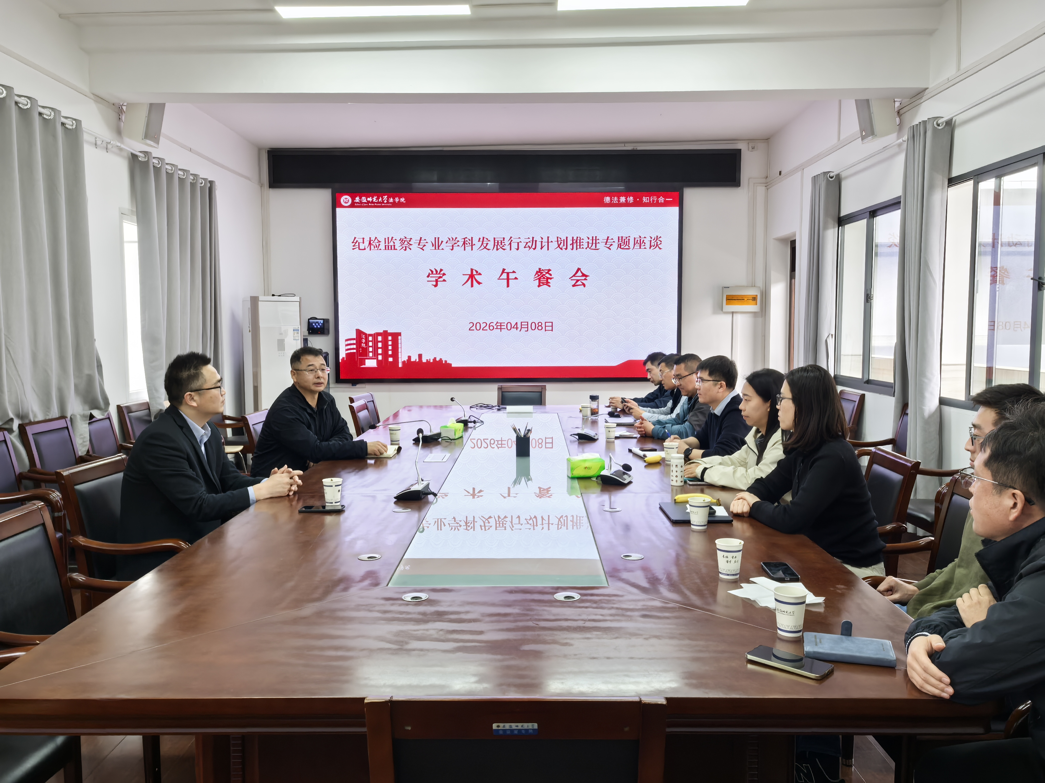 2026年4月8日,纪检监察教研室成立大会暨纪检监察专业学科发展行动计划推进专题座谈学术午餐会于法学院行政楼顺利举行。会议由郭泽强院长主持,陈银珠副院长、陈爱如副院长出席会议,纪检监察教研室骨干教师参会研讨。