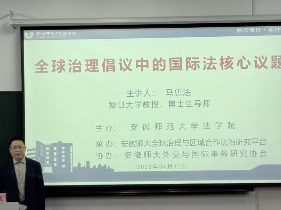 为丰富学术文化氛围,拓展师生全球视野,提升国际法教学与研究水平,安徽师范大学法学院于2026年4月11日在赭山校区教学楼103教室成功举办“全球治理倡议中的国际法核心议题”专题讲座。全球治理与区域合作法治研究平台项目负责人李路根老师主持,复旦大学法学院马忠法教授主讲。法学院教师代表赵建福老师、法学院24级学生代表,25级涉外法治实验班学生代表、安徽师大外交协会会员代表60余人参加。