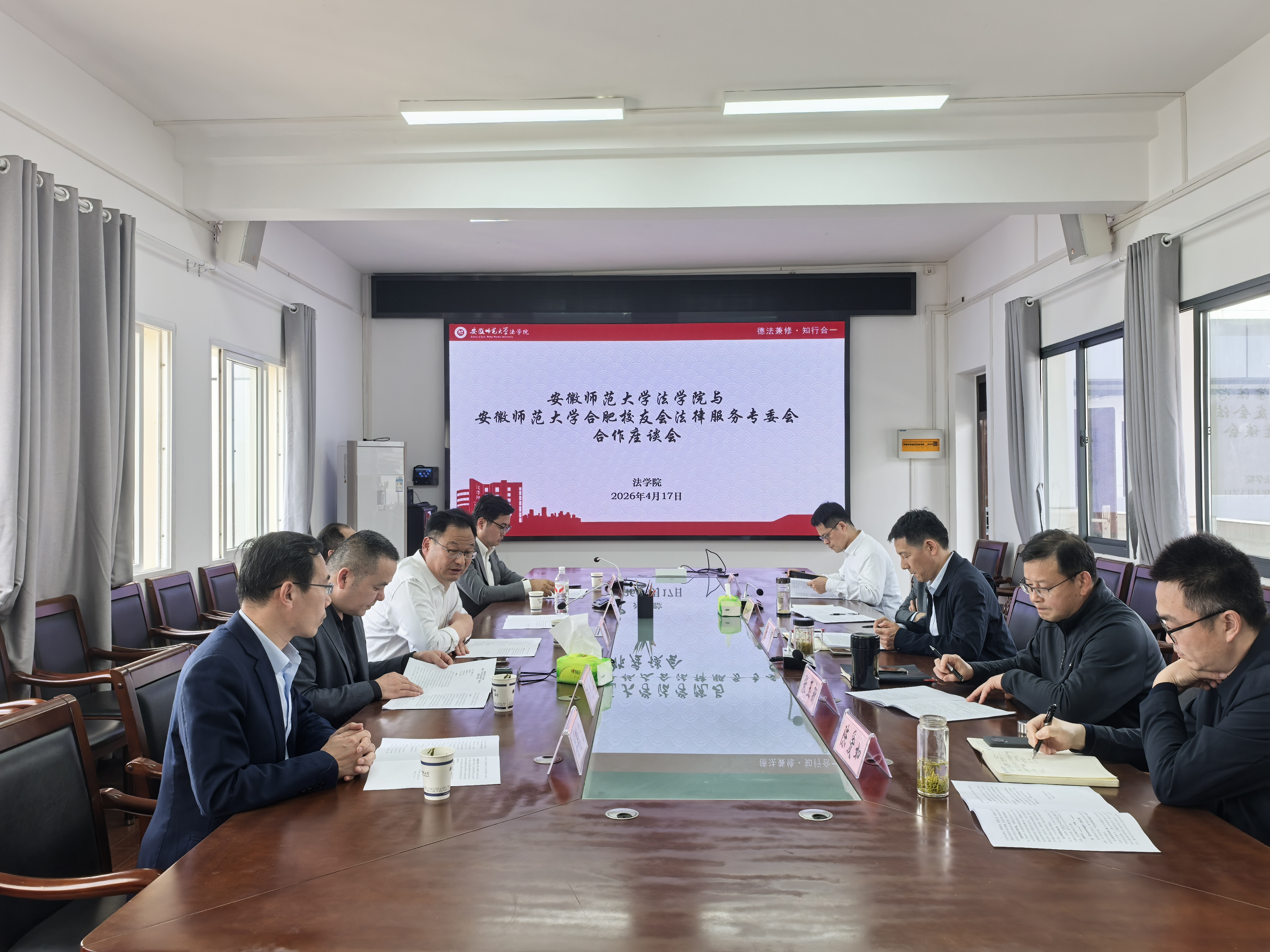 为进一步深化校地合作,整合校友资源,推动法学教育与实务深度融合,4月17日下午,安徽师范大学法学院与安徽师范大学法学院校友会在法学院515会议室举行合作座谈会。法学院党委书记张师帅、党委副书记张玉新、副院长徐成文、副院长陈银珠、副院长陈爱如参加座谈会。会议由张师帅主持。