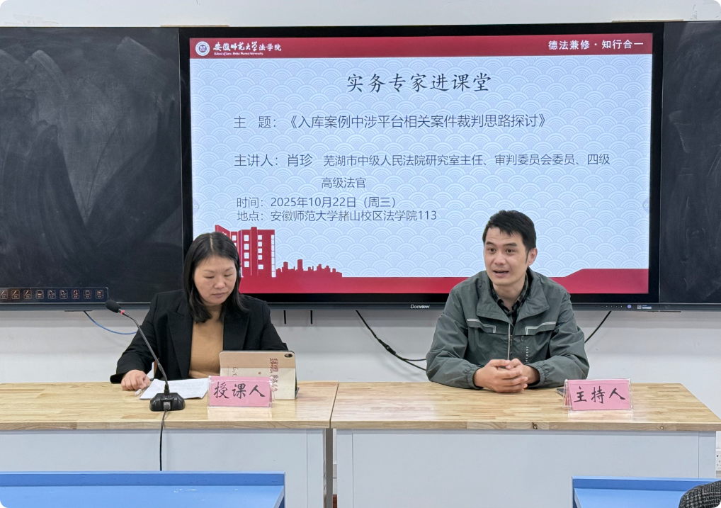 为推进研究生分类培养,凝练法律专业硕士研究生培养特色,完善以实践为导向的人才培养机制,10月22日,学院在113教室举行“实务专家进课堂”第七期。本次活动邀请到芜湖市中级人民法院研究室主任、审判委员会委员、四级高级法官肖珍法官担任主讲,安徽师范大学法学院讲师、硕士研究生导师韩瀚博士担任主持人,法律专业硕士研究生参加。
