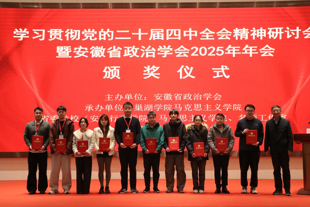 在闭幕式上,大会对优秀会议论文进行了表彰。我院2024级博士研究生林洋同学(右三)的论文荣获年会优秀论文奖,李宗楼教授为其颁发了获奖证书。池州职业技术学院旅游系副主任、总务处副处长何寅,安徽大学教授王进芬,巢湖学院马克思主义学院党总支书记、副教授杨芳,滁州市委党校(滁州行政学院)马克思主义基本理论教研室教授李邦松分别就四个分论坛的研讨情况作了总结汇报。安徽省政治学会学术委员会副主任、合肥工业大学马克思主义学院教授潘莉作大会总结。我院李宗楼教授应邀作闭幕致辞,他表示,年轻教师与研究生应积极参与学术交流,及时把握学科前沿动态,以此不断提升科研能力与论文质量。同时,他也对安徽省政治学会的未来发展表达了美好祝愿。(图/文 杨群)