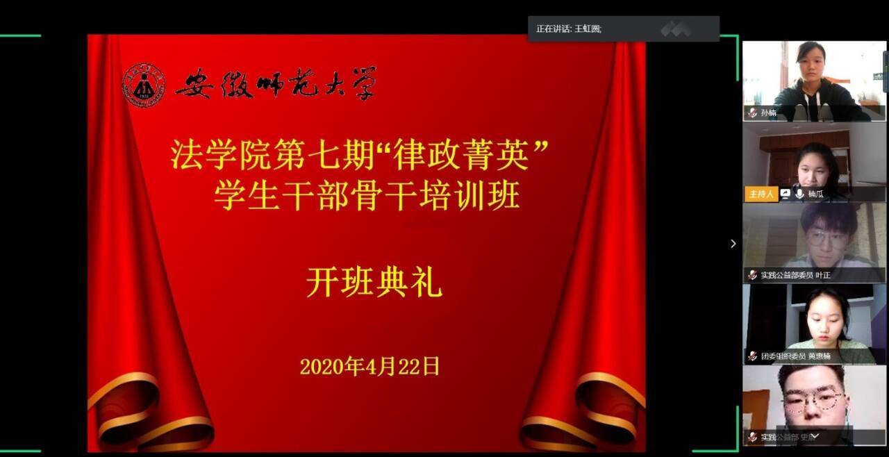 4月22日下午,法学院借助腾讯会议平台举办第七期“律政菁英”学生干部骨干培训班开班仪式。院团委书记王虹圆、院团委副书记储梦凡和冯晟、19级法学和行政管理班辅导员李晨冉、院团委学生副书记兼学生会副主席姚思宇、院学生会主席魏长睿出席开班仪式,培训班全体学员参加仪式,本次开班仪式由姚思宇主持。