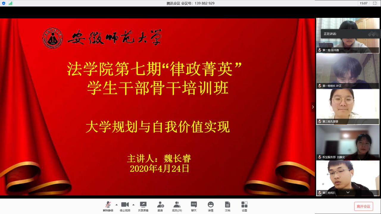 4月24日晚,法学院在腾讯会议平台举办了第七期“律政菁英”学生干部骨干培训班线上第一讲。本次课程由院学生会主席魏长睿担任此次课程的主讲人,院团委组织委员胡亚楠主持,培训班全体学员线上参与。