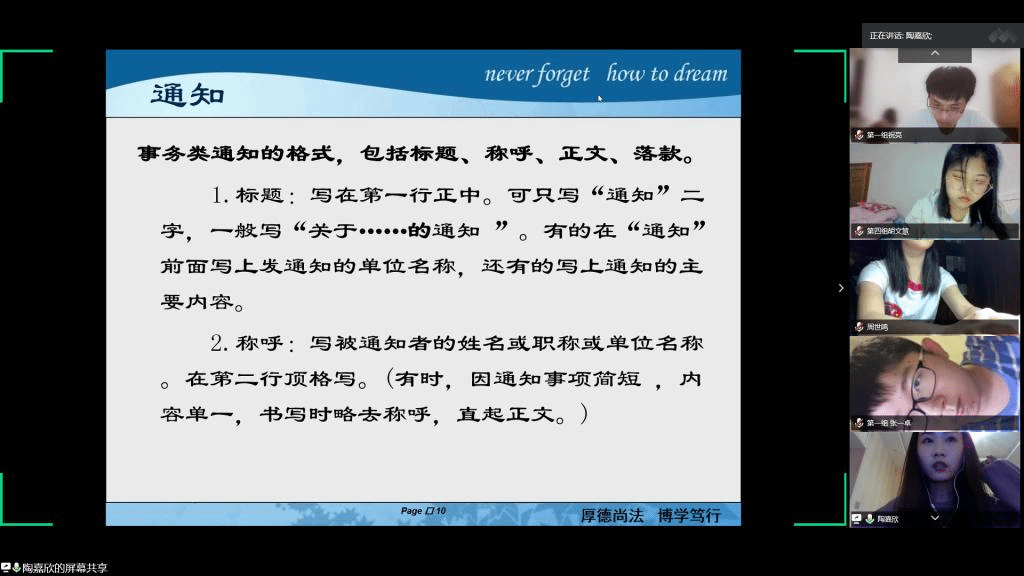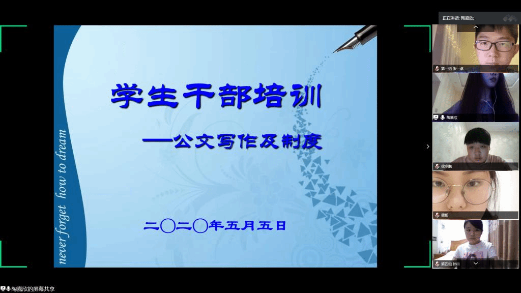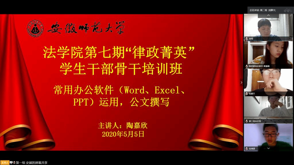 5月5日晚,法学院依托腾讯会议平台举办第七期“律政菁英”学生干部骨干培训班第四讲课程。本次课程由第六届院学生会副主席陶嘉欣主讲,培训班全体成员参与,院团委组织委员黄惠楠主持。