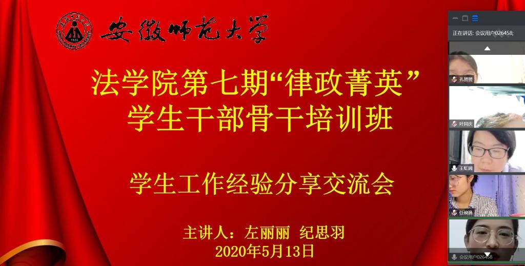 5月13日晚,法学院依托腾讯会议平台举办了第七期“律政菁英”学生干部骨干培训班第七讲课程活动。此次课程由法学院第四届团委学生副书记左丽丽和第四届院学生会副主席纪思羽主讲,院团委书记王虹圆出席,院团委委员、学生会各部门正副部长和培训班全体成员参加。