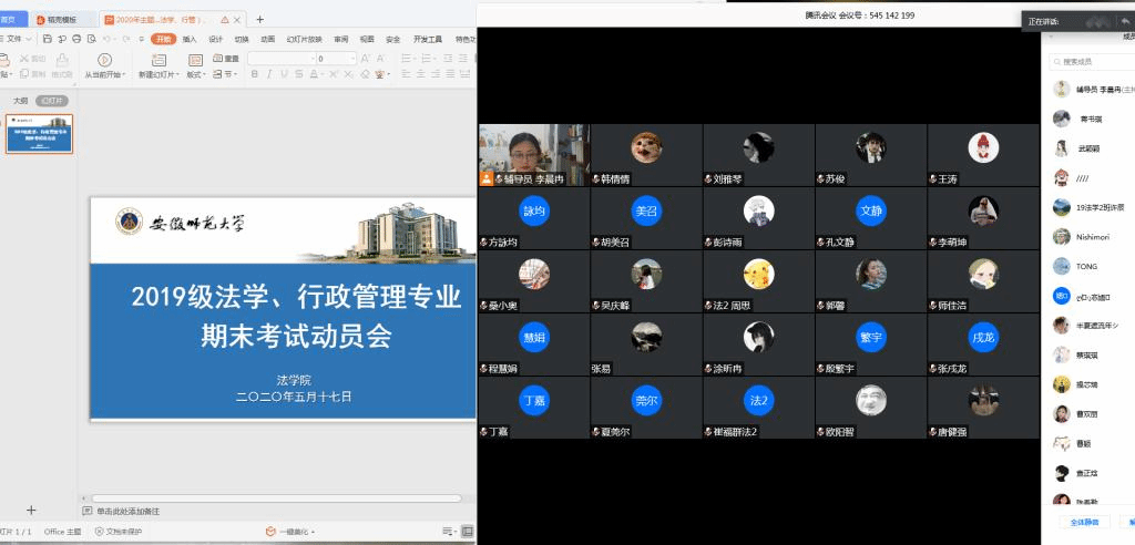 (本网讯 文/图 王梦羽)为充分调动全体同学的学习积极性,营造良好的期末复习氛围,严格考风考纪,践行诚信考试。5月17日晚19点,借助腾讯会议APP,法学院2019级辅导员李晨冉老师主持召开了法学和行政管理专业的期末考试动员大会,法学院2019级全体同学参加了此次会议。