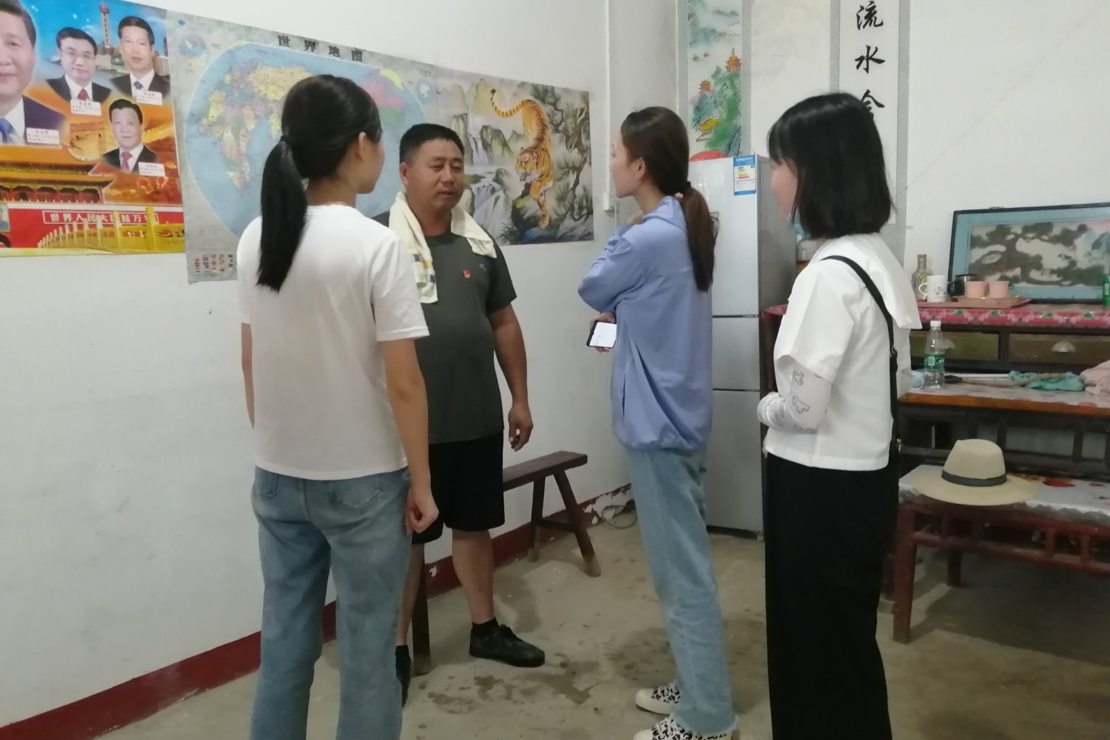 8月4日至5日调研组的成员们做好充分准备来到了王家坝镇政府,开启了实地调研的旅程。在和镇政府党委书记以及其他工作人员的访谈中,队员们了解到,王家坝闸本次开闸蓄洪直接受国家防总的指挥调度,并且是时隔十三年再开闸。由于王家坝闸处于中上游分界处,上保河南,下保江苏,为淮河防汛抗洪发挥了巨大的社会效益。队员们还看到了汛情最严重时期的照片。通过和政府工作人员进一步谈话和采访,队员们感受到了一线救灾工作的艰苦,体会到了王家坝民众为此次汛情做出的巨大付出。此外队员们还在镇政府工作人员的带领下熟悉了王家坝镇的周边环境,确定了问卷走访的具体村落,并走进了当地居民家中发放调研问卷。这两天中,队员们采访了三位王家坝镇政府的工作人员,走访了三个庄台,发放并收集问卷 80 张。
