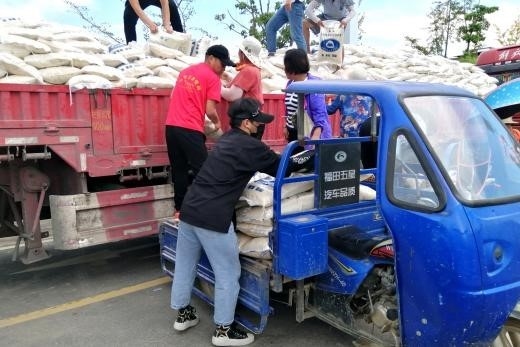 8月6日下午调研组的成员们帮助志愿者们从大货车上卸救灾物资—大米,并将卸下来的一袋袋大米垒放整齐。