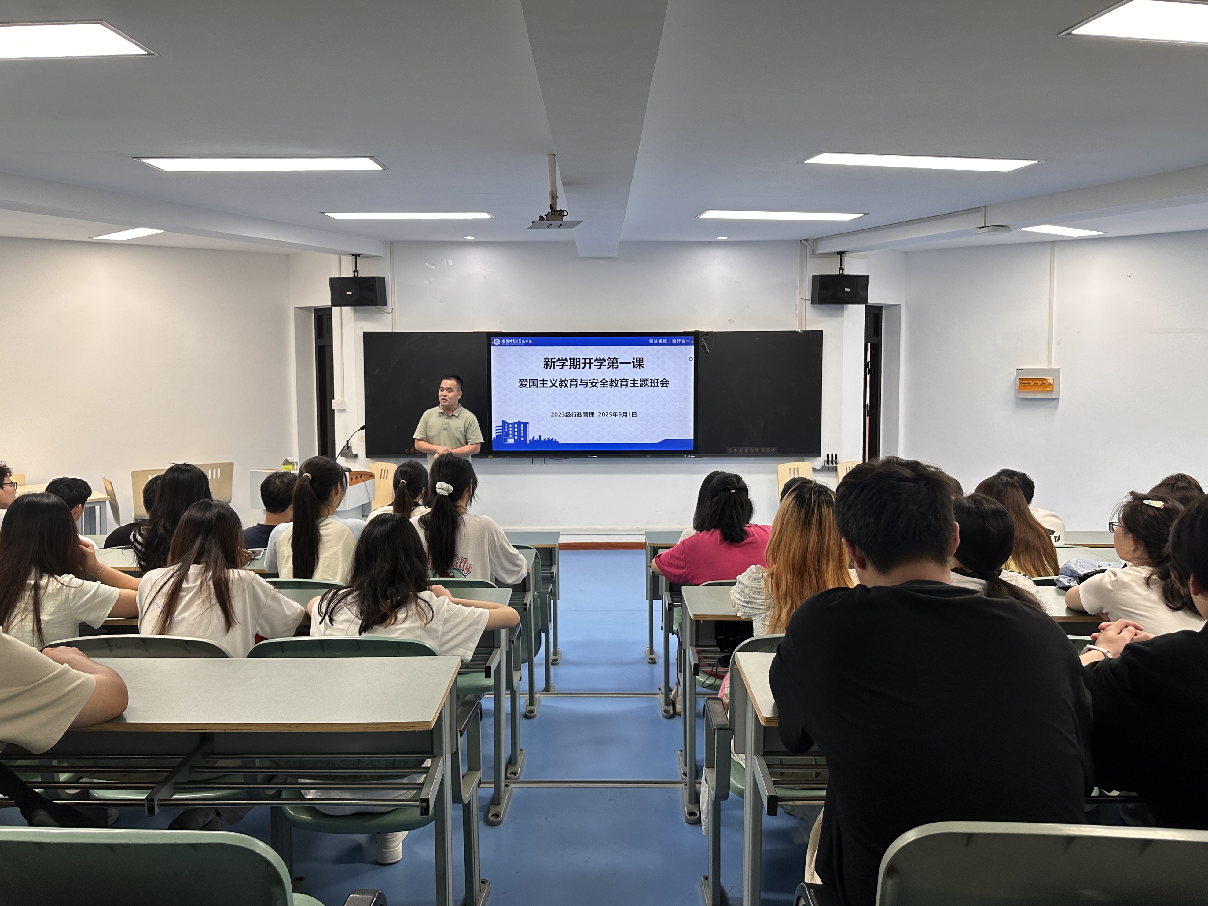 为进一步强化学生的家国情怀与安全意识,明确学年规划,2025年9月1日下午,23级行政管理专业于法学院行政楼314教室召开新学期开学第一课——爱国主义教育与安全教育主题班会,班会由辅导员陈兴宇主持,班级全体同学参会。