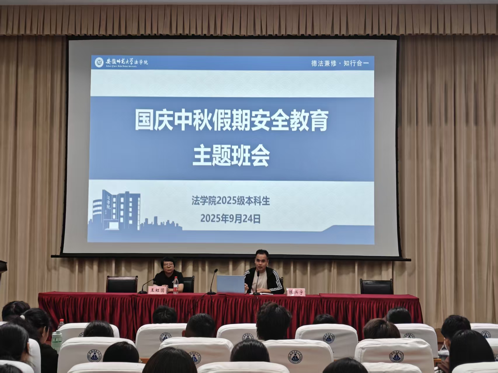 在2025级新生即将迎来大学生涯首个国庆中秋小长假之际,为切实增强新生的安全防范意识,确保全体同学度过一个平安、愉快、充实的假期,学院于9月24日下午在模拟法庭组织召开2025级新生国庆中秋假期安全教育主题班会。班会由2025级新生辅导员王虹圆、陈兴宇共同主持,全体新生参加。