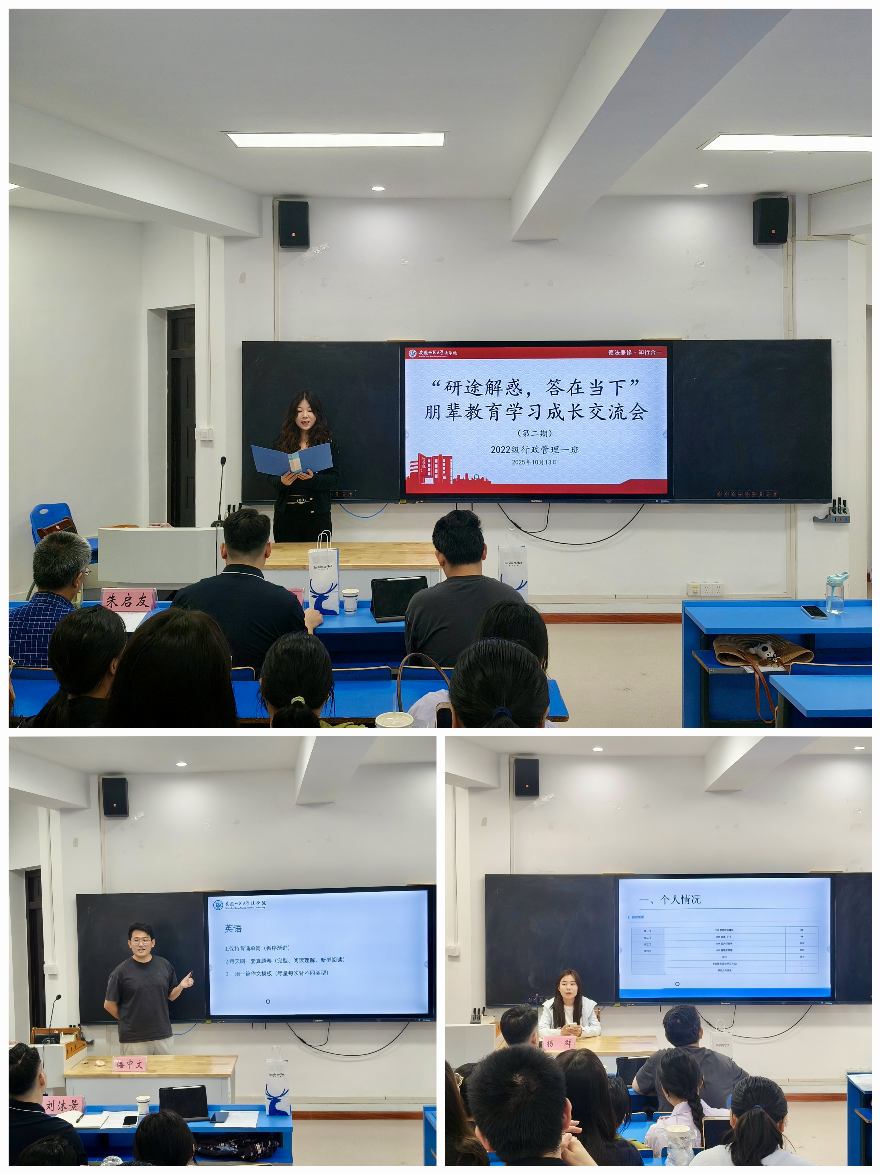 本网讯(法学院 康雨晴)为切实帮助学生解决备考中的难点问题,10月13日,法学院2022级行政管理专业于行政楼113教室举办“研途解惑,答在当下”朋辈教育学习成长交流分享会。班主任朱启友和研究生潘中文、杨群受邀参会。会议由刘沐景主持,全体学生参与。
