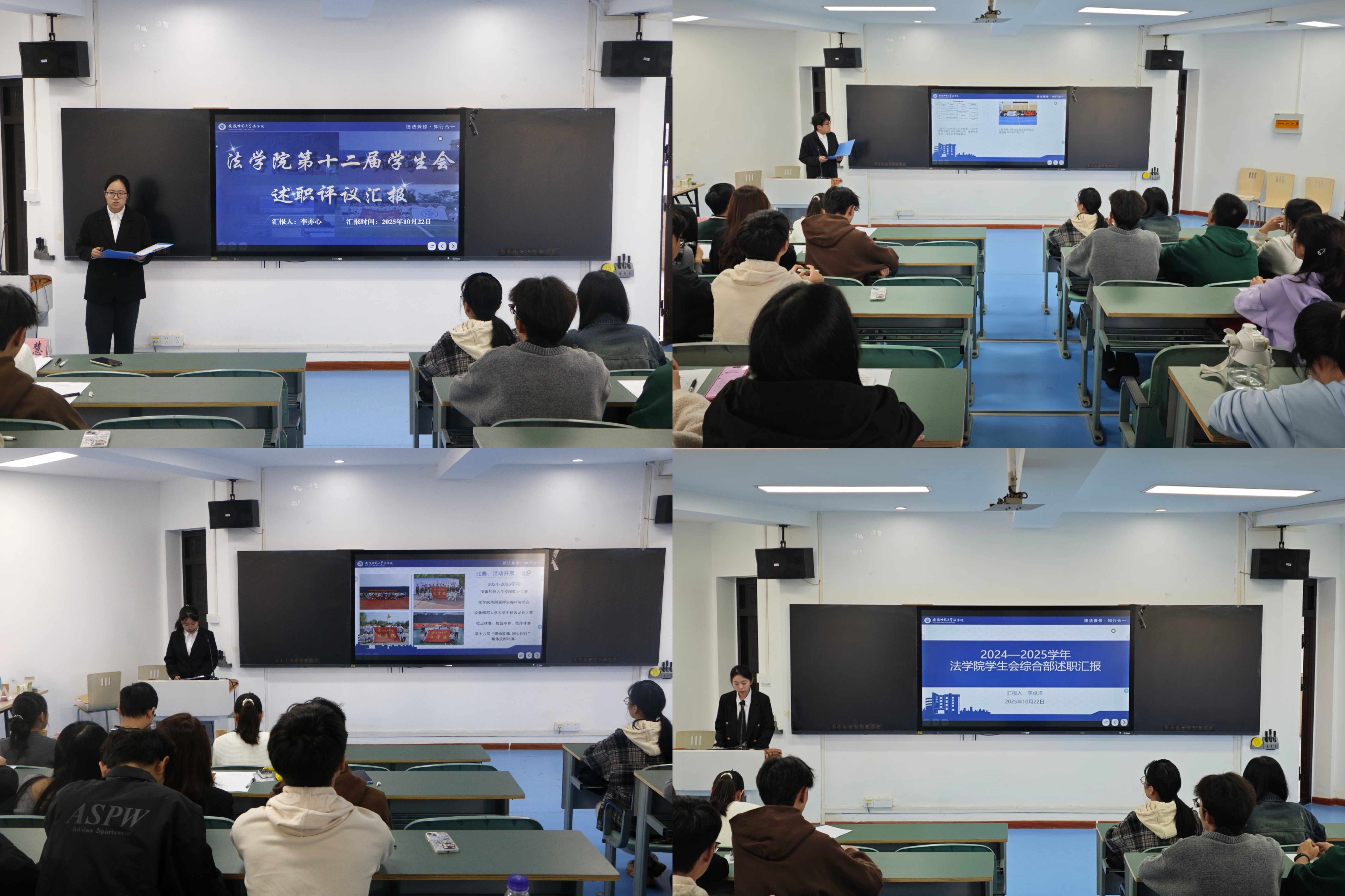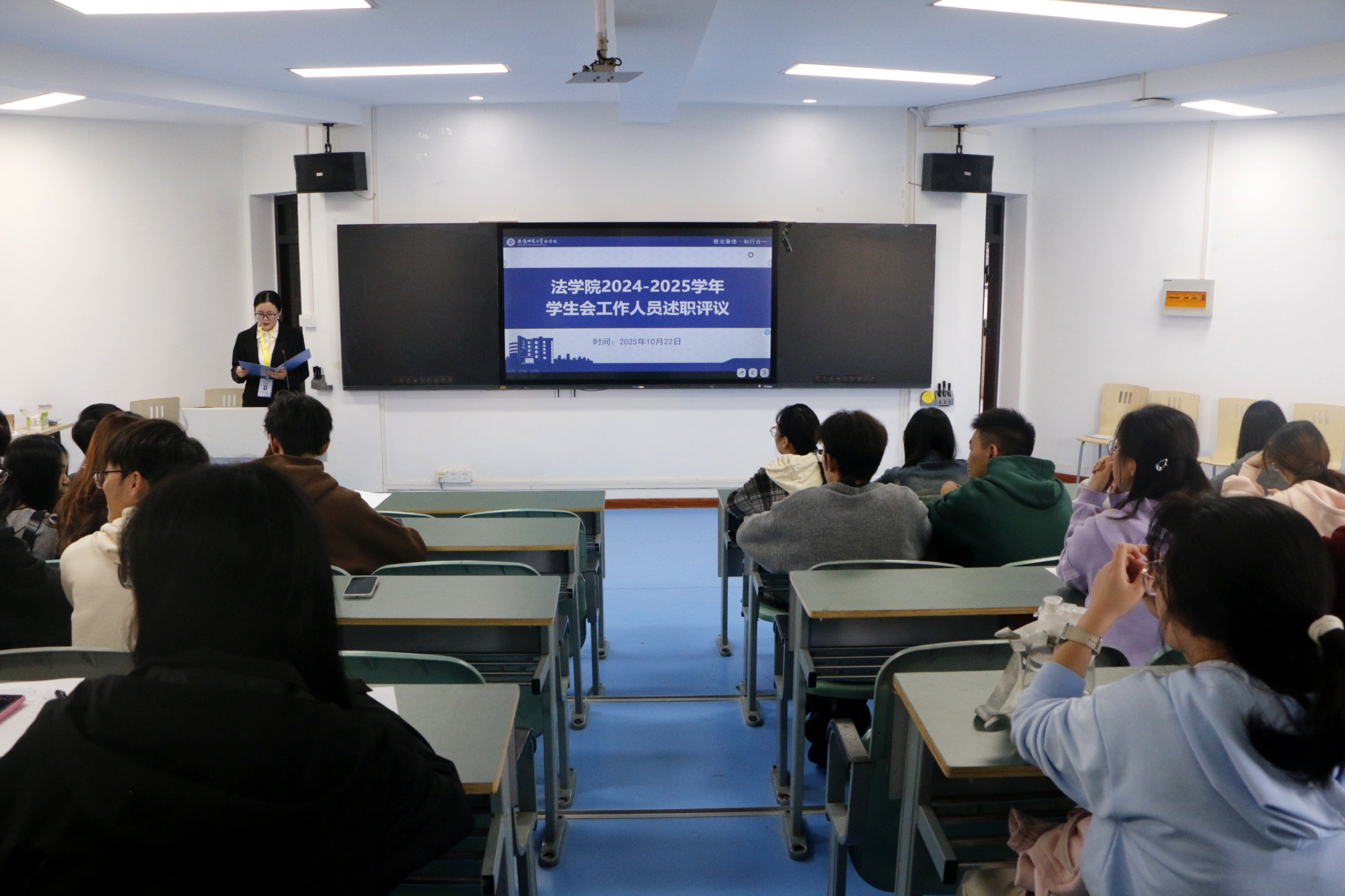 为全面总结法学院学生会在服务同学、推进大学生护航行动计划中的工作成果,进一步加强学生会组织规范化建设,深入贯彻“全心全意为同学服务”的宗旨,10月22日下午,法学院于行政楼314召开2024—2025学年学生会工作人员述职评议会议。法学院团委书记、2024级法学专业辅导员崔健,团委副书记、2022级法学专业辅导员朱慧,校学生会代表张立云受邀出席。法学院第十二届学生会主席团代表李亦心、各部门负责人、各班级班长及学生代表参加。