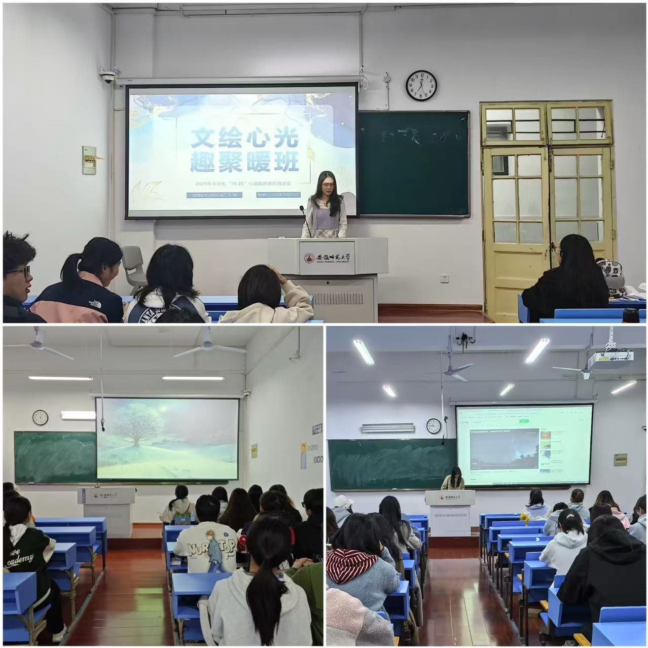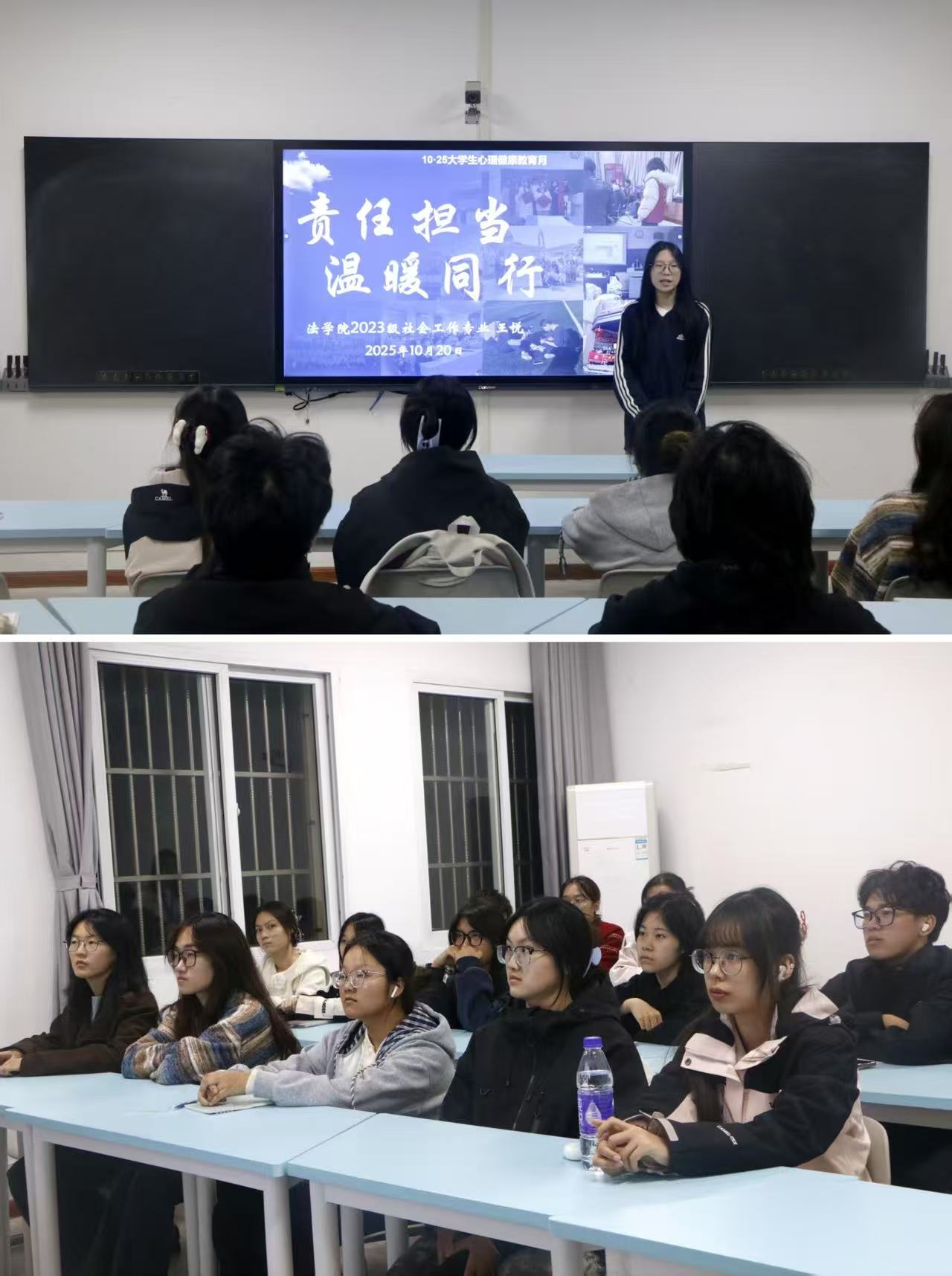 班级深耕:立足专业特色,激活基层育人活力。学院通过引导各班级结合专业特点与学生成长需求,开展精准化、个性化的心理健康实践活动,让心育工作扎根基层。2024级法学一班举办心理健康主题观影交流会,通过集体观看《男孩、鼹鼠、狐狸和马》,引导学生在角色陪伴与哲理对话中理解“寻求帮助并非放弃”的真谛,小组评析环节进一步深化了情感共鸣;2025级法学一班创新开展主题班会,将法学专业特色与心理健康教育深度融合,摒弃单向宣讲模式,通过互动环节拉近同学距离,会后建立“心理能量补给站”,搭建长期分享支持平台;2025级社会学一班以“情绪觉察与互助”为核心,开展情绪交换盲盒、集体接画等趣味活动,同学们在“飞出烦恼、接力创作”中释放压力、建立连接,切实增强了班级凝聚力。