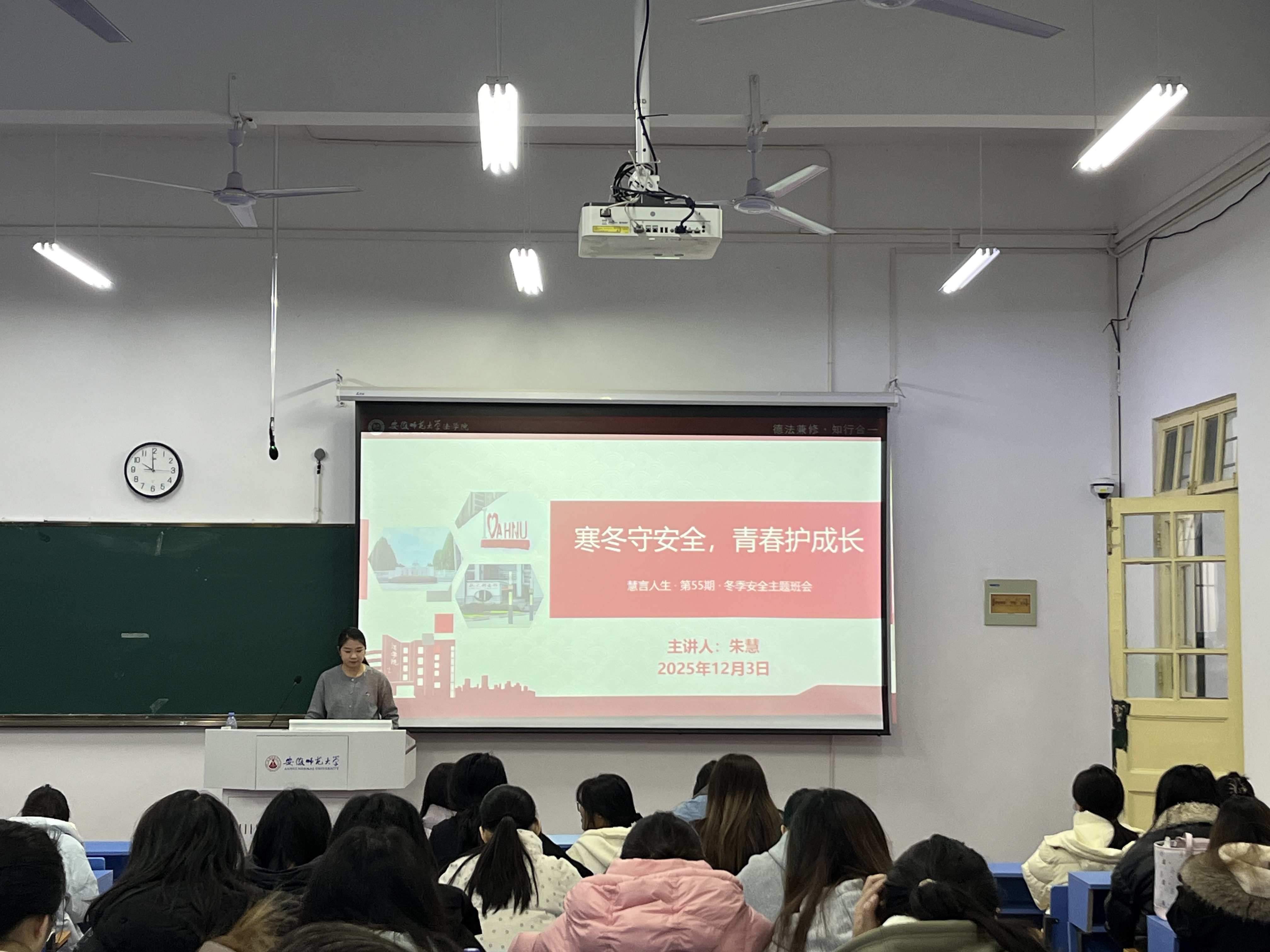 为增强学生冬季安全意识,提高自我保护能力,12月3日上午,法学院2022级法学专业召开“寒冬守安全,青春护成长”冬季安全教育主题班会,班会由辅导员朱慧主持,2022级法学专业全体同学参加。