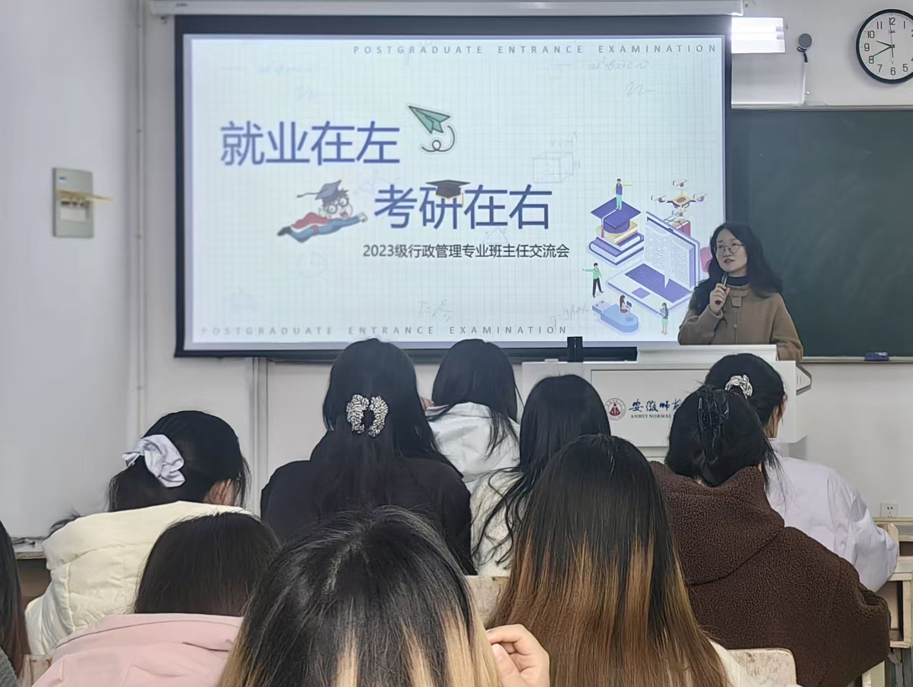 为帮助2023级行政管理专业学生厘清毕业发展路径,破解考研与就业抉择难题,2025年12月3日,在班主任纪媛媛老师主持下,该专业于行政楼1408召开了考研就业指导会,23级行管专业全体本科生参会。