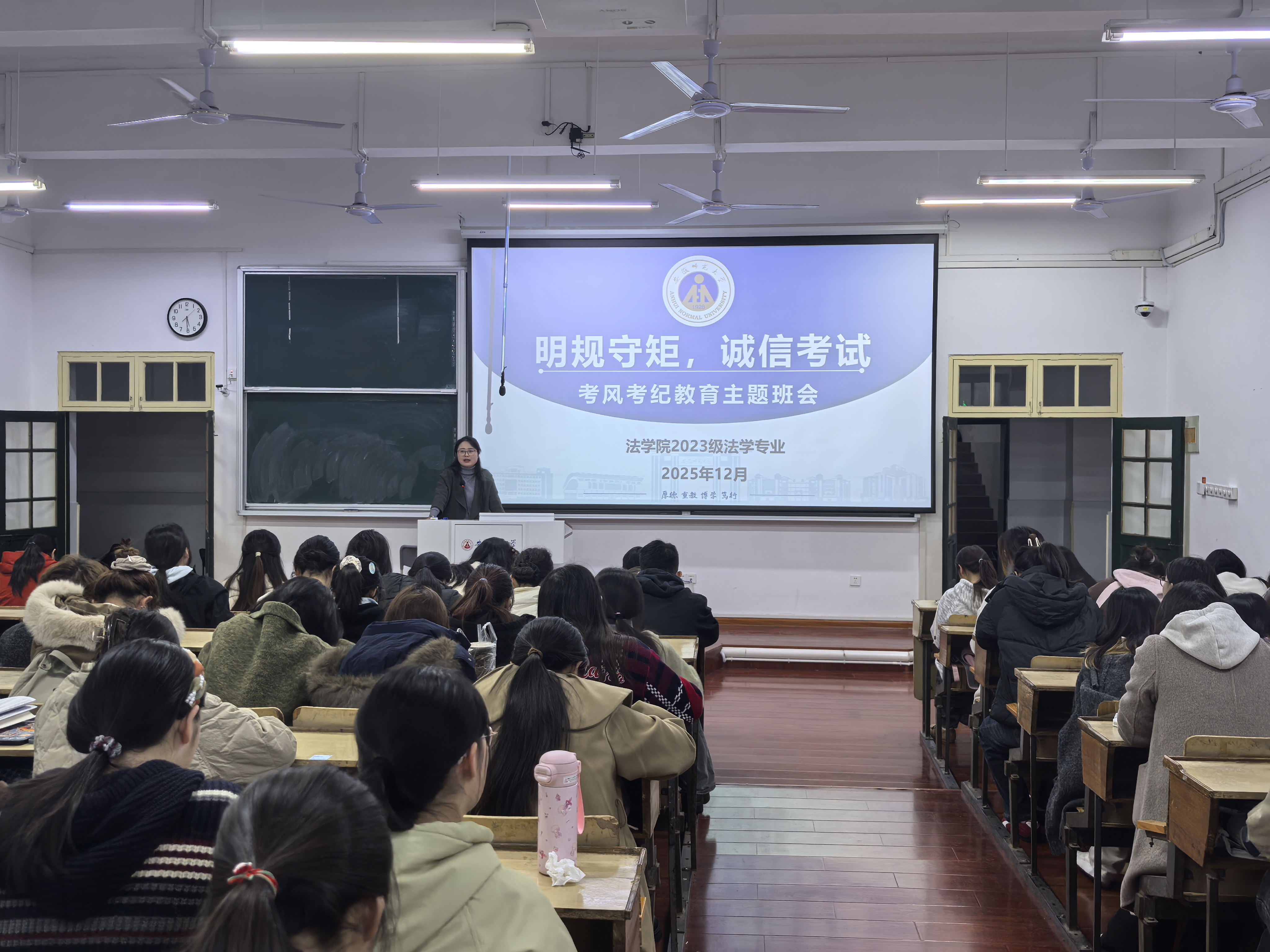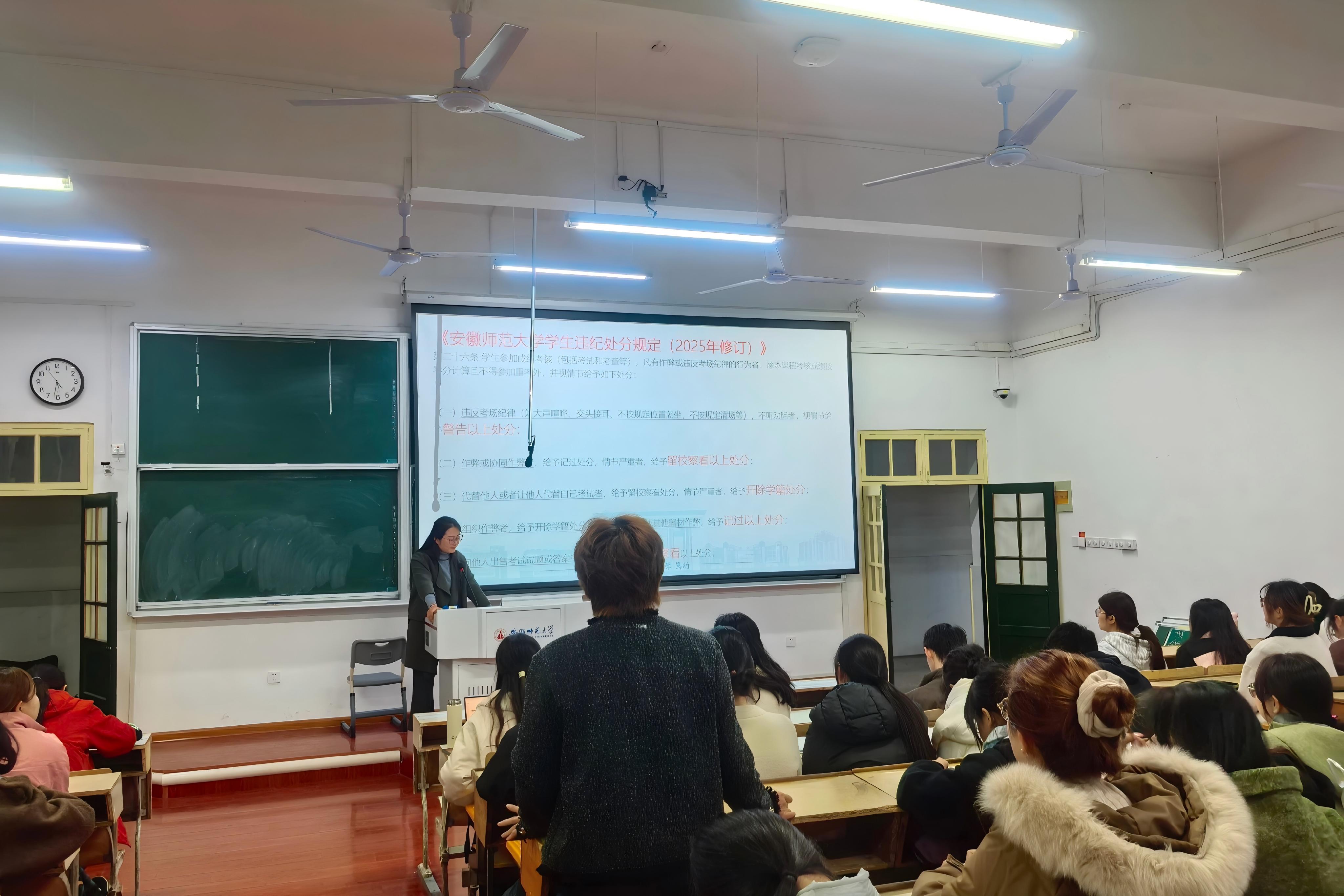 班会伊始,辅导员结合法学专业人才培养要求,强调诚信不仅是道德准则,更是法律人必备的职业素养。随后,重点带领全体同学学习《安徽师范大学学生违纪处分规定(2025 年修订)》第二十六条内容,明确指出凡在成绩考核中存在作弊或违反考场纪律行为的,本课程成绩按零分计且不得重考,同时将根据情节轻重给予相应纪律处分,详细解读了不同处分级别的具体界定与对应处分标准。