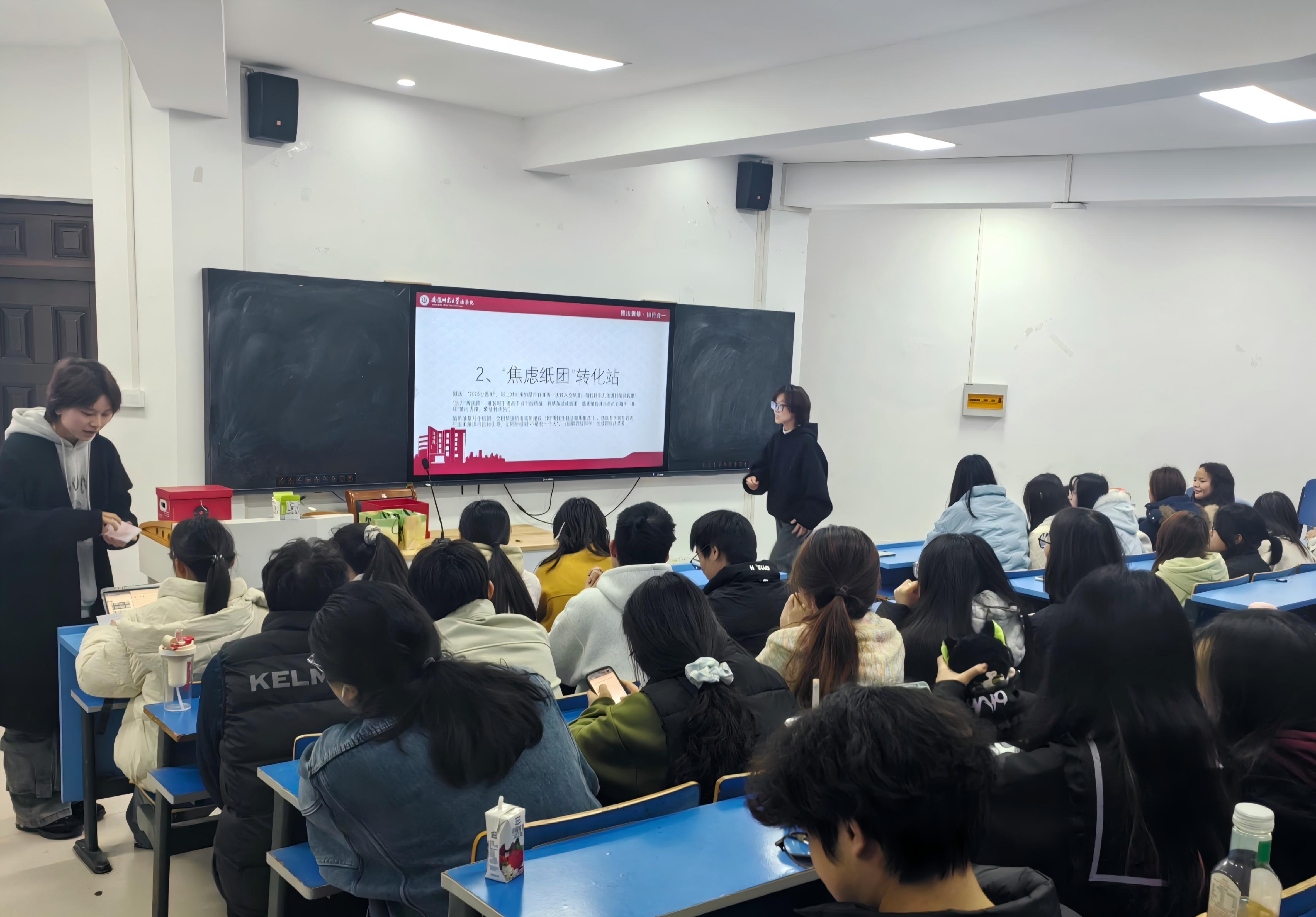 “心灵驿站·温暖同行”环节聚焦情绪关怀,成为整场联欢会的“治愈担当”。在“焦虑纸团”转化站,同学们拿起笔,将过去一年的学业压力、生活烦恼、迷茫困惑一一写在纸上,揉成纸团轻轻投入纸箱。随着纸团的投入,仿佛也卸下了心头的重担,现场弥漫着彼此理解、相互慰藉的温情。而“夸夸联盟速递”环节更是将温暖推向高潮,大家或以匿名纸条或现场口头分享的方式,真诚夸赞身边同学的闪光点。一句句暖心的赞美如冬日暖阳,驱散了阴霾,让每个人都感受到被认可、被珍视的幸福感。