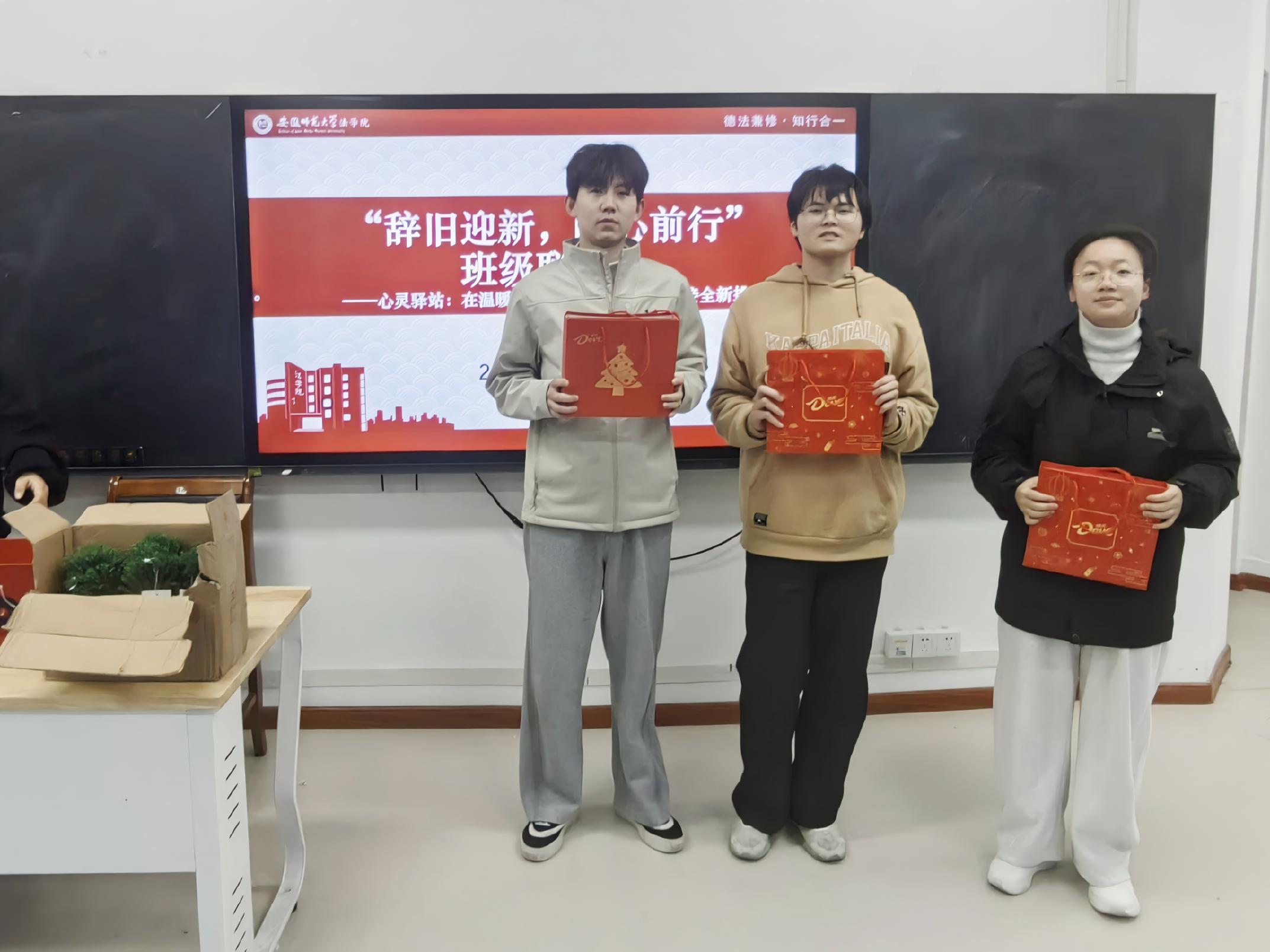(本网讯 钱正清 李晨冉)喜迎新年序章,辞别旧岁过往。时值期末备考关键期,为缓解同学们冬日情绪低落与学业焦虑,凝聚班级向心力,激发备战期末、勇毅前行的斗志,营造温暖祥和、奋发进取的班级氛围,2023级法学3班于法学院行政楼113教室温馨举办“辞旧迎新,暖心前行”主题班级联欢会。