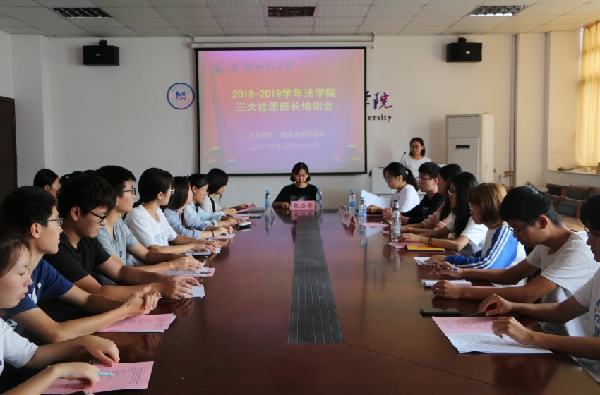 9月26日,法学院团委社团管理部于行政楼四楼会议室召开2018-2019学年法学院三大社团部长培训会。学生会主席兼团委学生副书记张沥丹、团委社团管理部部长胡月、团委素质拓展部部长牛智辉、职业能力发展研究会会长赵梓萌、外交与国际事务研究协会会长叶媛媛及三大社团各部门部长参加会议,会议由胡月主持。