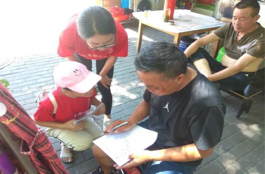 队员们于户外对社区居民进行了问卷调查,通过与他们的面对面交谈,了解了其对政策的了解程度、老年人口在社区公共活动的参与情况以及居民对于社区工作者日常工作的满意程度。