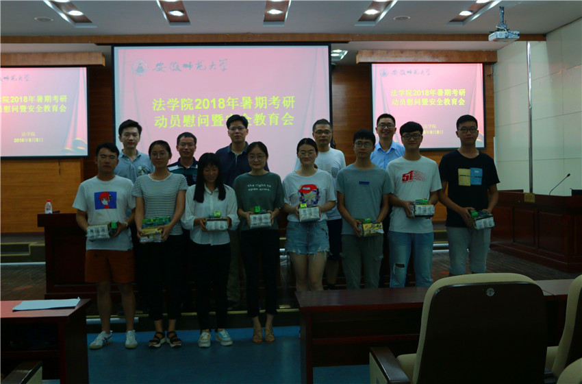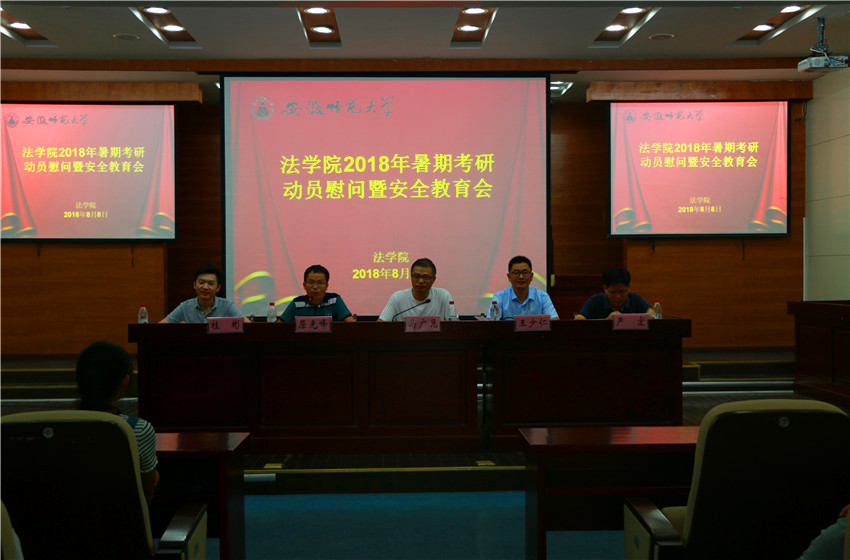 8月8日下午,法学院2018年暑期考研动员慰问暨安全教育会在模拟法庭举行。院党委书记马广见、党委副书记王少仁、副院长严宏,2015级法学专业辅导员桂彬和2015级全体留校考研学生参加会议,会议由副院长屈光峰主持。
