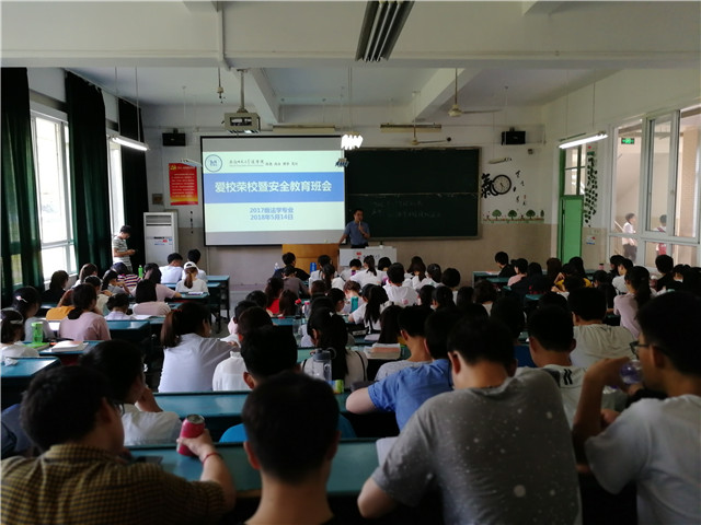 值师大90周年校庆来临之际,为营造良好的文化氛围,增强学生爱校荣校意识,同时对我院学生进行安全健康教育,法学院2017级法学专业班级于 5月14日下午在行知楼2020104教室举行了爱校荣校暨安全教育主题班会,会议由辅导员陈星宇老师主持,法学一班及法学二班全体同学参加本次班会。