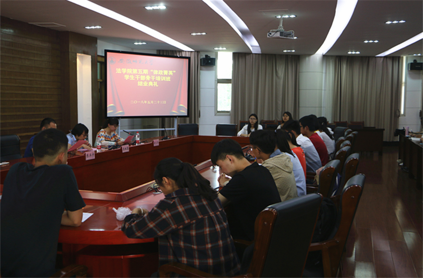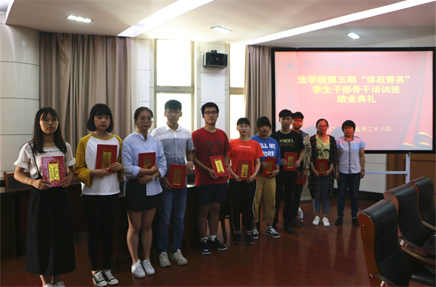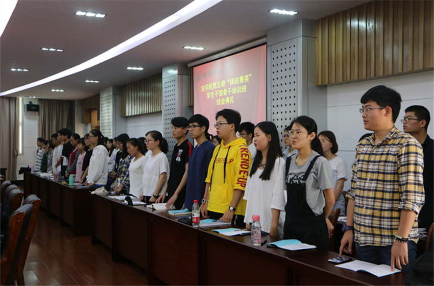 5月23日下午,法学院于第一报告厅举行第五期“律政菁英”学生干部骨干培训班结业典礼。院团委书记王虹圆、院团委副书记兼2017级法学专业辅导员陈兴宇以及2017级行政管理专业辅导员赵义丹出席,培训班全体学员参与其中,此次典礼由院团委组织部部长张正雪主持。