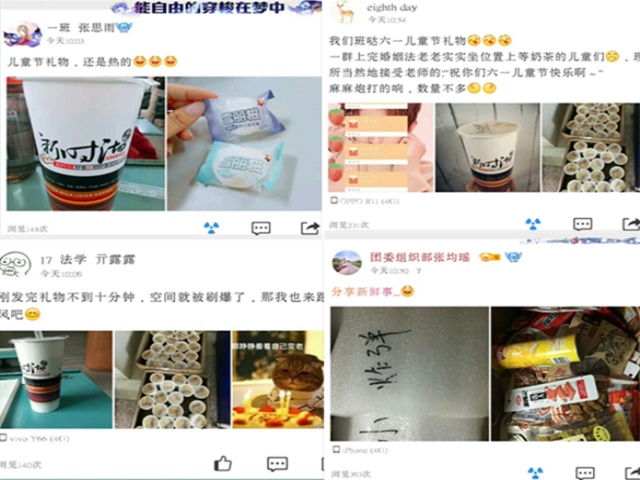 法学一班的班委们早早采购好奶茶、糖果,利用中午时间分发给同学们,同学们相聚在班级,喝奶茶、吃糖果,唇齿间留下满腔幸福。大家互相聊天、谈心,一起细数童年时的美好回忆,所有的甜蜜温馨都在聊天中,悄悄融化在每一个同学的心间。