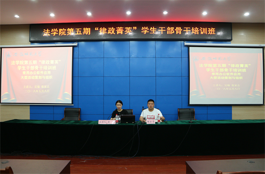 5月8日,法学院于第三报告厅举办第五期“律政菁英”学生干部骨干培训班第三讲。院学生会常务副主席吴瑞、学生会副主席张家志受邀担任此次主讲人,培训班全体成员参与。