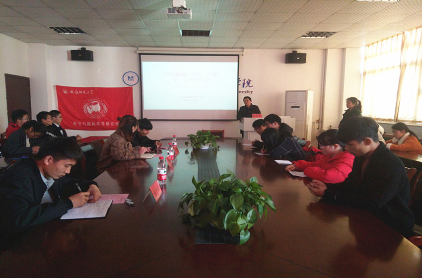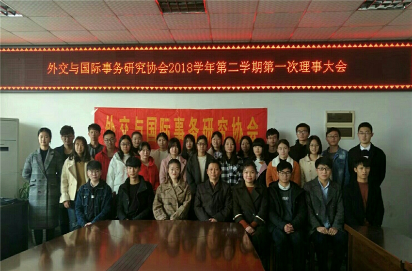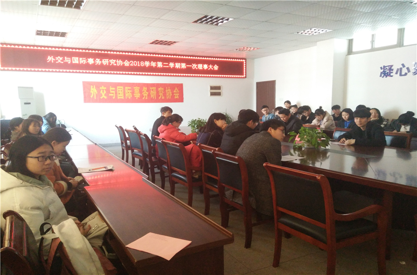 3月10日下午,外交与国际事务研究协会在法学院行政楼四楼会议室成功举办了2017-2018学年第二学期第一次理事大会。社团指导老师李路根莅临指导,出席此次会议的有社管部代表杜欢、会长孙瑞以及各部门部长及理事。本次大会由办公室副主任叶媛媛主持。