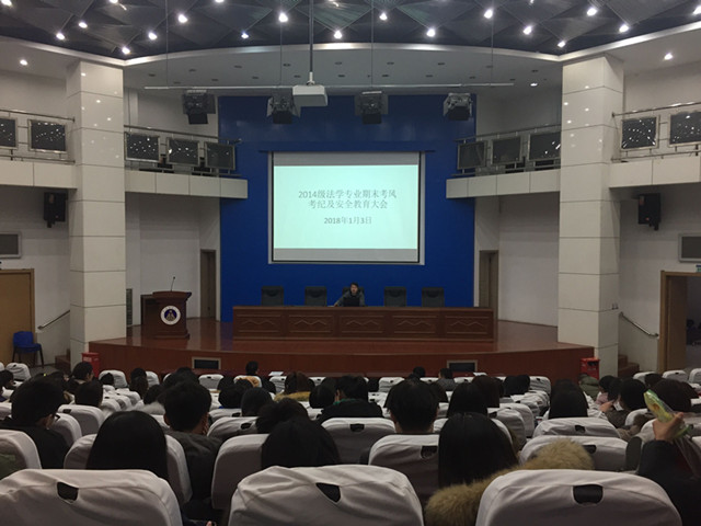 2018年1月3日下午1点,2014级法学期末考风考纪及安全教育会议在敬文报告厅举行,会议由2014级法学专业辅导员王琳主持,全体2014级法学专业学生到场参与。