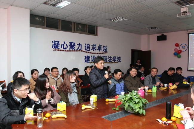 2017年12月22日晚6时30分,法学院2017年研究生茶话会在法学院行政楼四楼会议室举行。出席本次茶话会的有何源章副院长、周仁标教授、李路根副教授、2017级辅导员胡旗保老师、陈勇老师、法学院研究生会主席齐新以及2017级研究生们。班级班委为同学们精心准备了瓜子、水果、糖果和一些小礼物,师生们在其乐融融的气氛中共叙情谊。