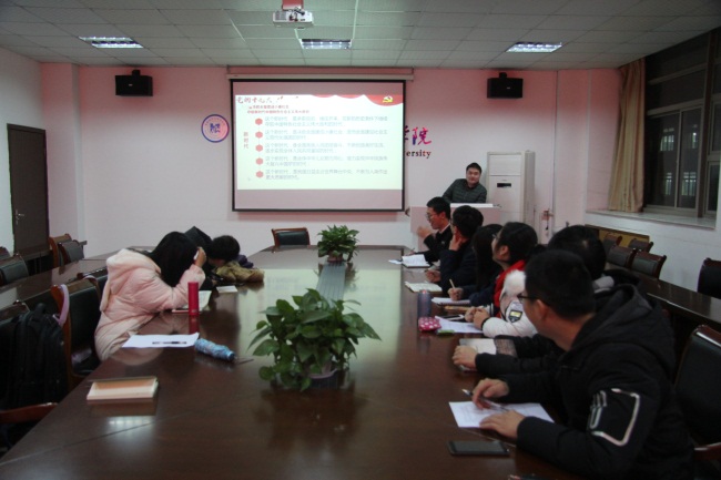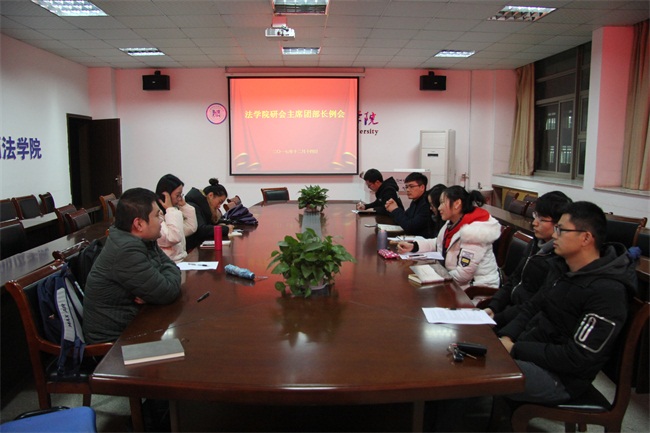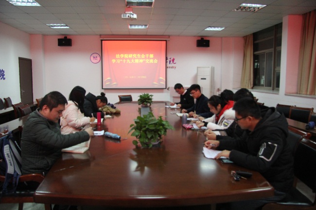 2017年12月14日晚,法学院研会主席团部长例会暨研会干部学习“十九大精神”交流会在法学院四楼会议室召开,会议由法学院研究生会主席齐新主持,研会主席团成员与各部门部长参与了此次会议。