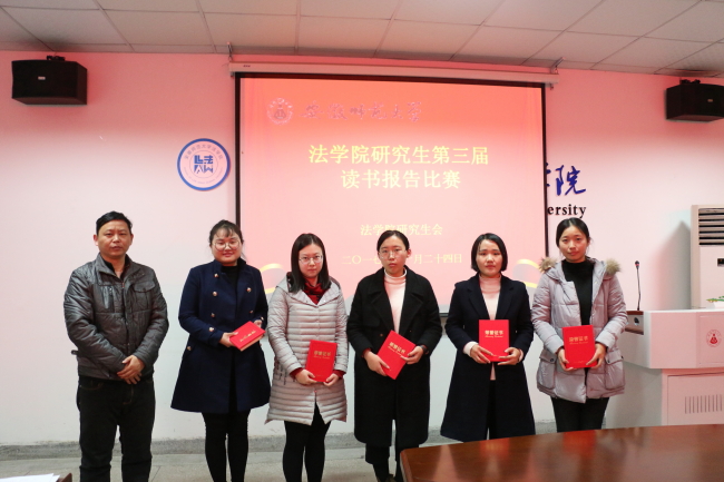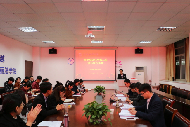 11月24日,法学院研究生第三届读书报告比赛在行政楼四楼会议室举办。此次比赛邀请何源章副院长、法学专业李路根老师、院研会主席齐新、宋余波担任评委,由研会学报编辑部委员任克鹏主持。全体研会成员参与观看了此次比赛。