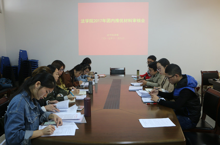 11月8日下午,法学院在行政楼三楼学生会办公室召开了学院2017年团内推优材料审核会,院团委书记王虹圆受邀出席,院团委学生副书记刘闯、院团委组织部全体成员以及15、16级各班级团支书参加会议。