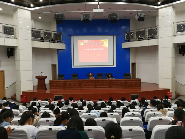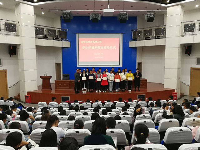 11月4日上午10:00,,辅导员陈兴宇和赵义丹在敬文报告厅召开了学生干部示范岗启动仪式暨党团知识教育大会,全体17级法学院同学参加此次会议。