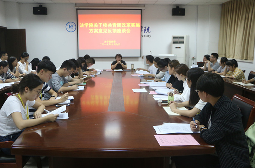 10月9日晚,法学院团委于行政楼四楼会议室召开了关于校共青团改革实施方案意见反馈座谈会。院团委书记王虹圆、团委全体成员、学生会主席团成员、院三大社团会长、各班级团支书及认证委员参加会议,此次座谈会由院团委学生副书记刘闯主持。