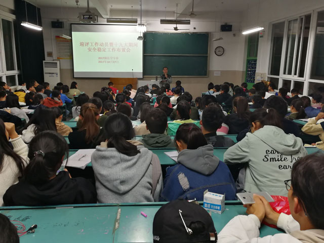 10月17日晚上8:00,为迎接本科教育评估和布置十九大期间班级相关工作,17级法学专业在行知楼2020104教室召开本科迎评工作动员暨十九大期间安全稳定工作布置会。会议由陈兴宇主持。