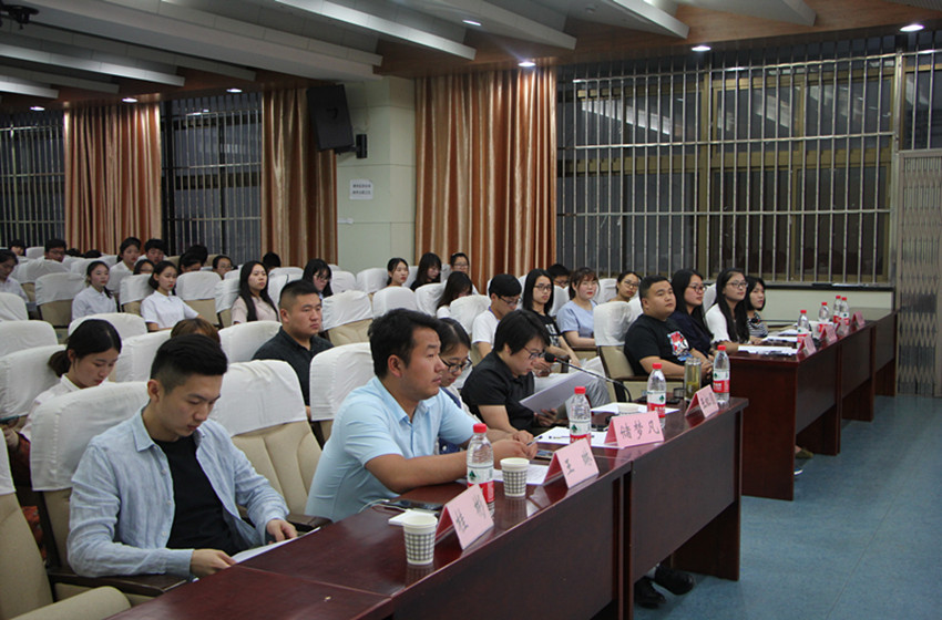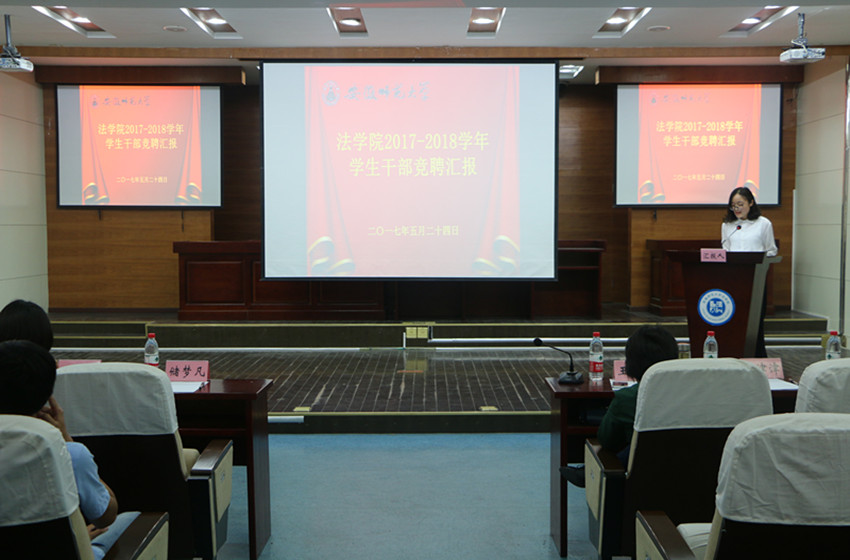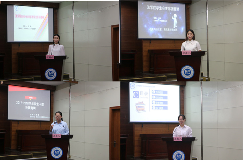 为完成学院学生干部新老交替,选拔出一批优秀合格学生干部,法学院于5月24日、26日在模拟法庭召开学院2017—2018学年学生干部换届竞聘大会。院团委书记王虹圆、14级法学专业辅导员王琳、16级行政管理专业辅导员桂彬、16级法学专业辅导员储梦凡、原院学生会主席古藤、团委学生副书记左丽丽、学生会主席团成员及学院三大社团会长出席大会,院团委、学生会成员参与此次大会。