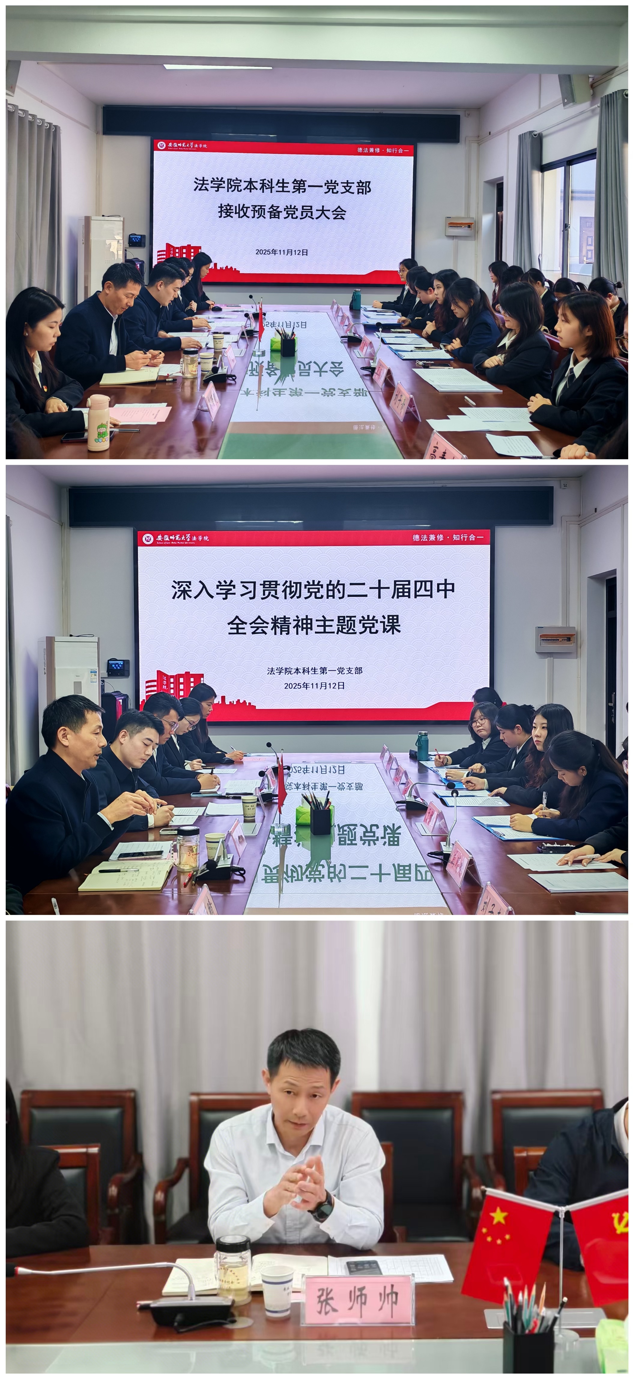 11月12日,法学院本科生第一党支部在行政楼515教室召开接收预备党员大会。法学院党委书记张师帅列席会议,支部全体党员参加,会议由支部书记主持。
